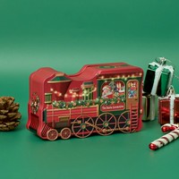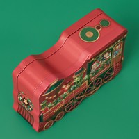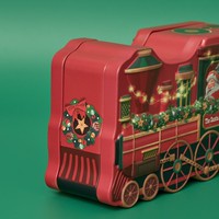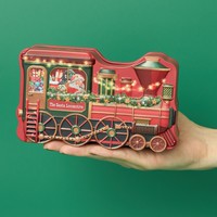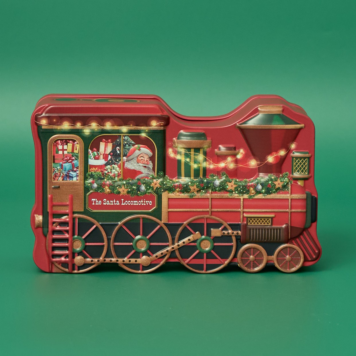 サンタが機関車に乗って、クリスマスプレゼントを運ぶ楽しいデザインの缶に、