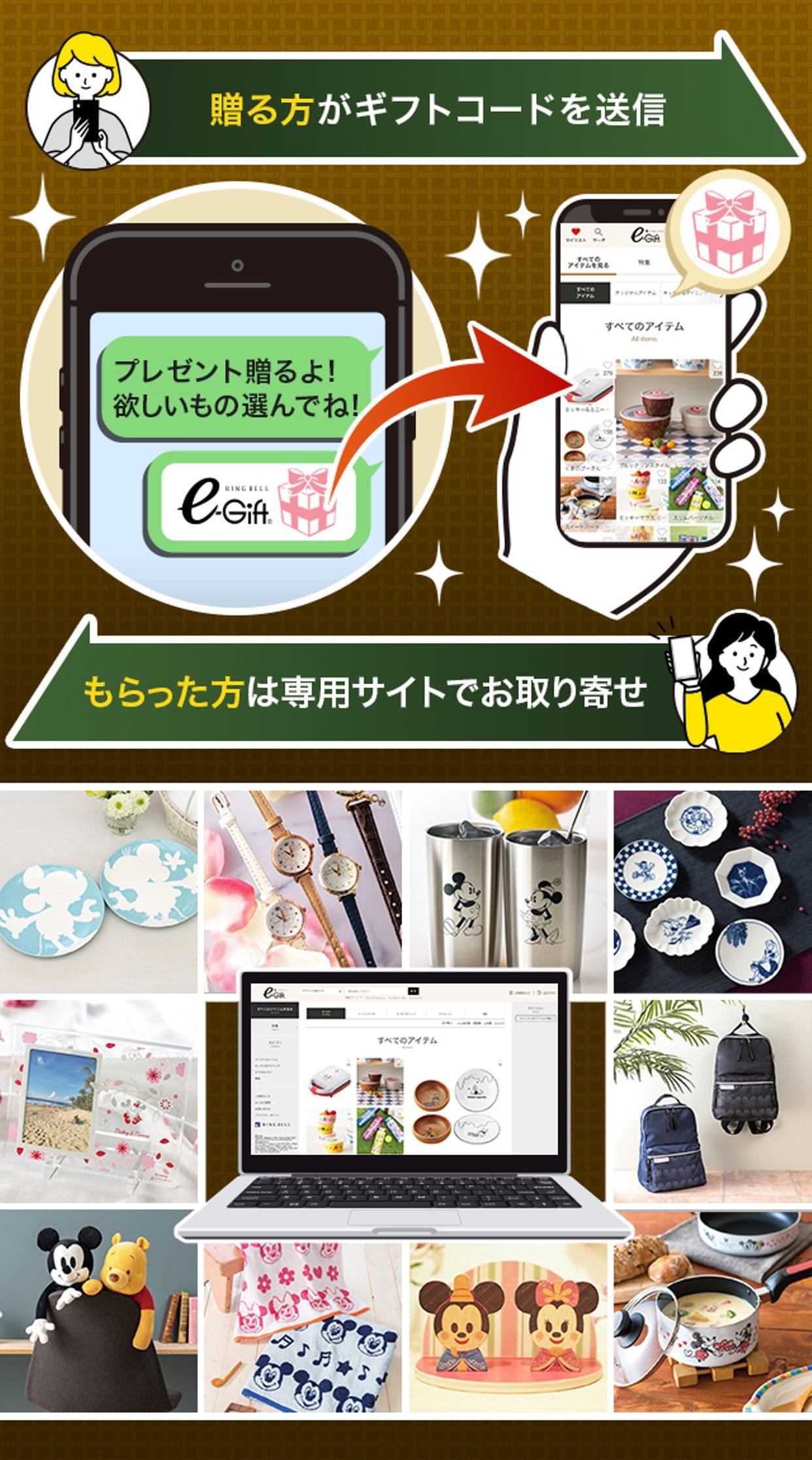 スマホで贈れるカタログギフトは。今すぐLINEで贈れるデジタルカタログギフトです。受け取った方は、LINEでお送りするギフトコードを使って、専用サイトからお好きなお品をお取り寄せいただくことができるギフトサービスです。スマホで贈れるディズニーカタログギフトe-Giftは、世界で唯一リンベルだけが販売するディズニー商品だけを集めたAll that's Disneyのオンラインカタログギフトです。