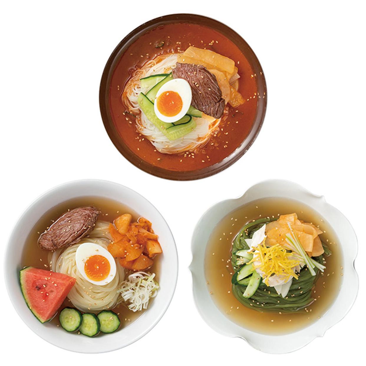 〈ぴょんぴょん舎〉で大人気の三大冷麺が楽しめるセット。一番人気の盛岡冷麺に、奥深い辛みのピビン冷麺、上品に香る桑の葉冷麺をお届けします。