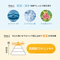ワセリン、セラミド、ヒアルロン酸、ももの葉エキスの保湿成分をは配合。