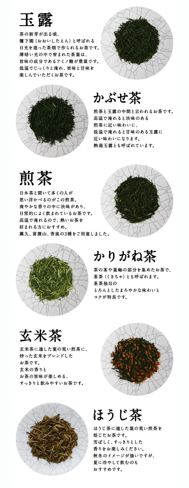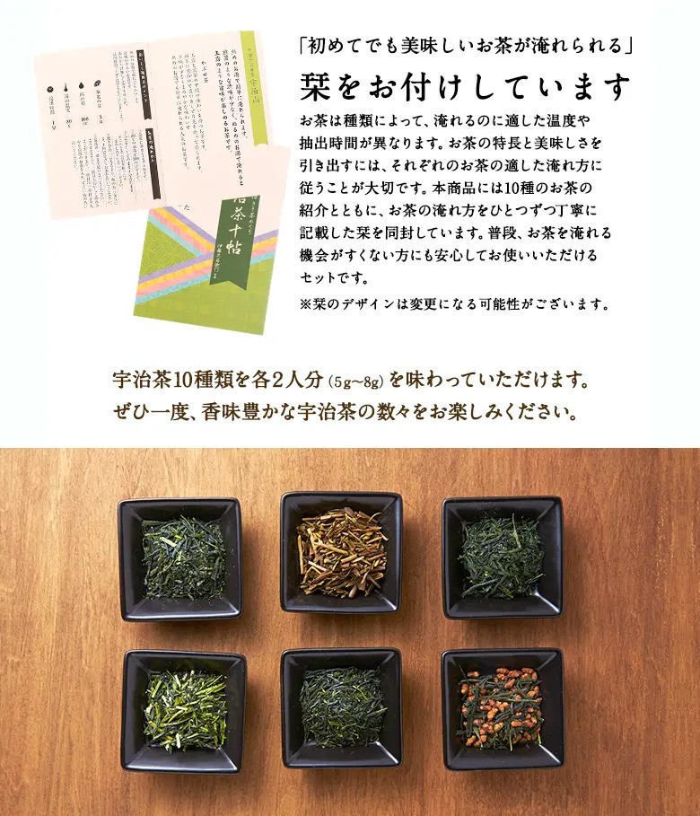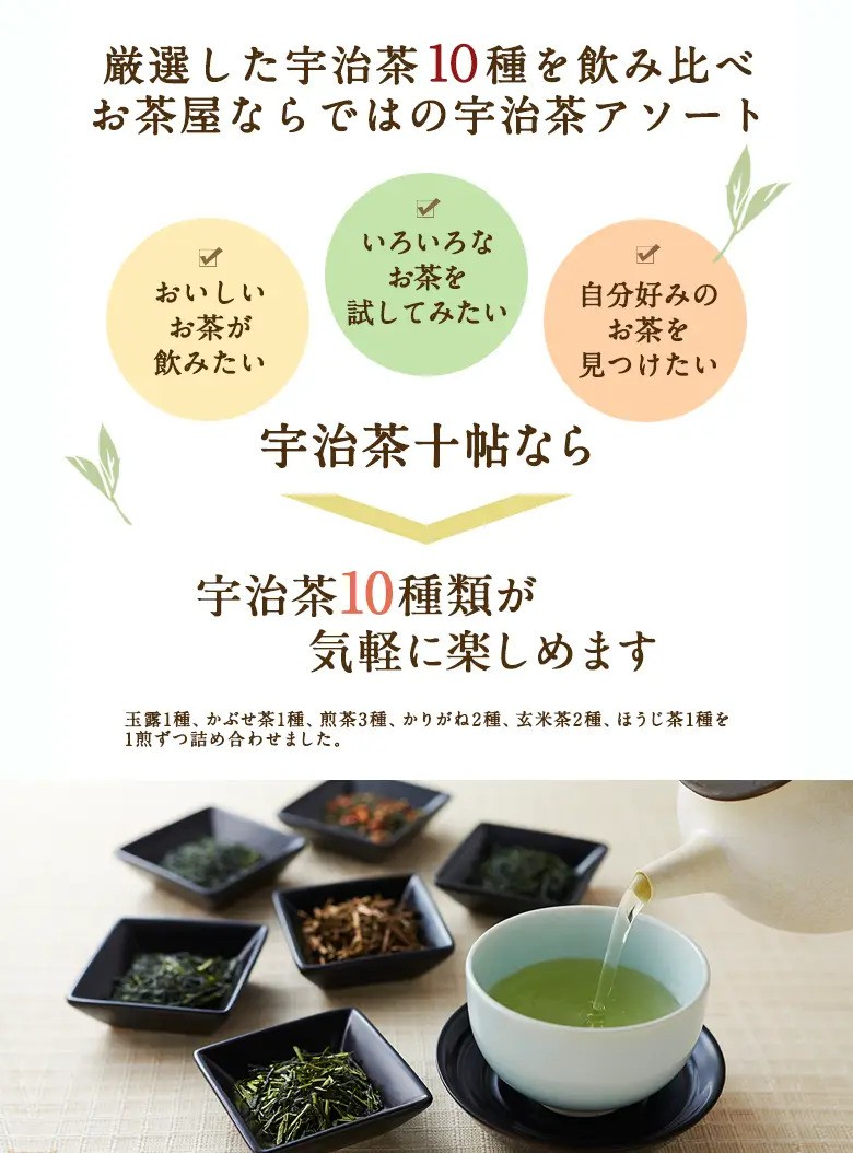 当店を代表する10種類の茶葉をお試しいただけます。『必ず美味しく飲める淹れ方』の栞を付けてお届け。まずはこのお試しセットでお好みの宇治茶を見つけてください。