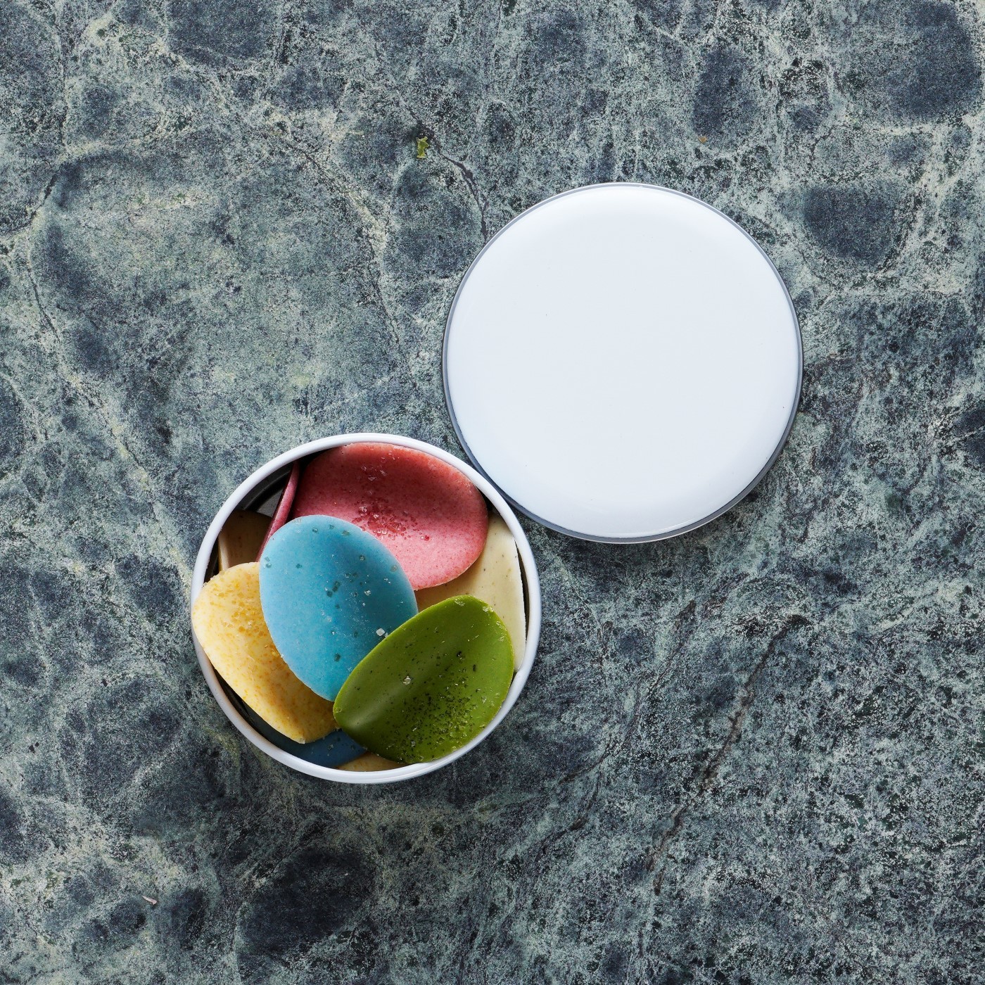 ホワイトチョコレート(砂糖、カカオバター、全粉乳)(フランス製造)、砂糖、カカオバター、ストロベリーパウダー、マンゴーパウダー、柚子果皮砂糖漬け、木苺パウダー、抹茶、茶葉、バラ花弁、ジャスミン、ミント/乳化剤、スピルリナ色素、香料(一部に乳成分を含む)