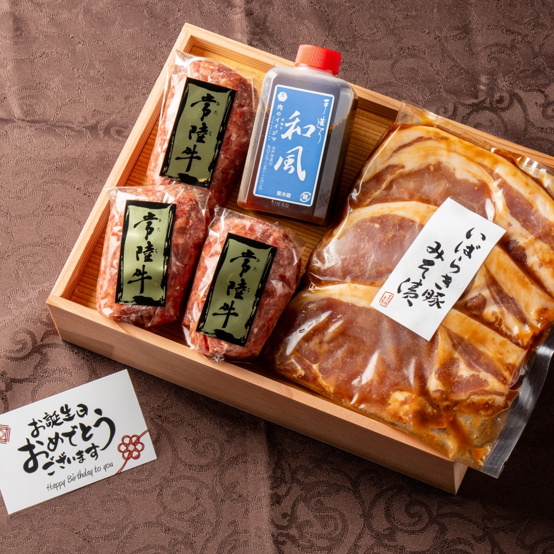 創業半世紀のお肉屋さんが造るこだわりの無添加ハンバーグと秘伝のタレに漬けたやわらかみそ漬けセット。 茨城の素材の味わいが詰まったギフトセットです。