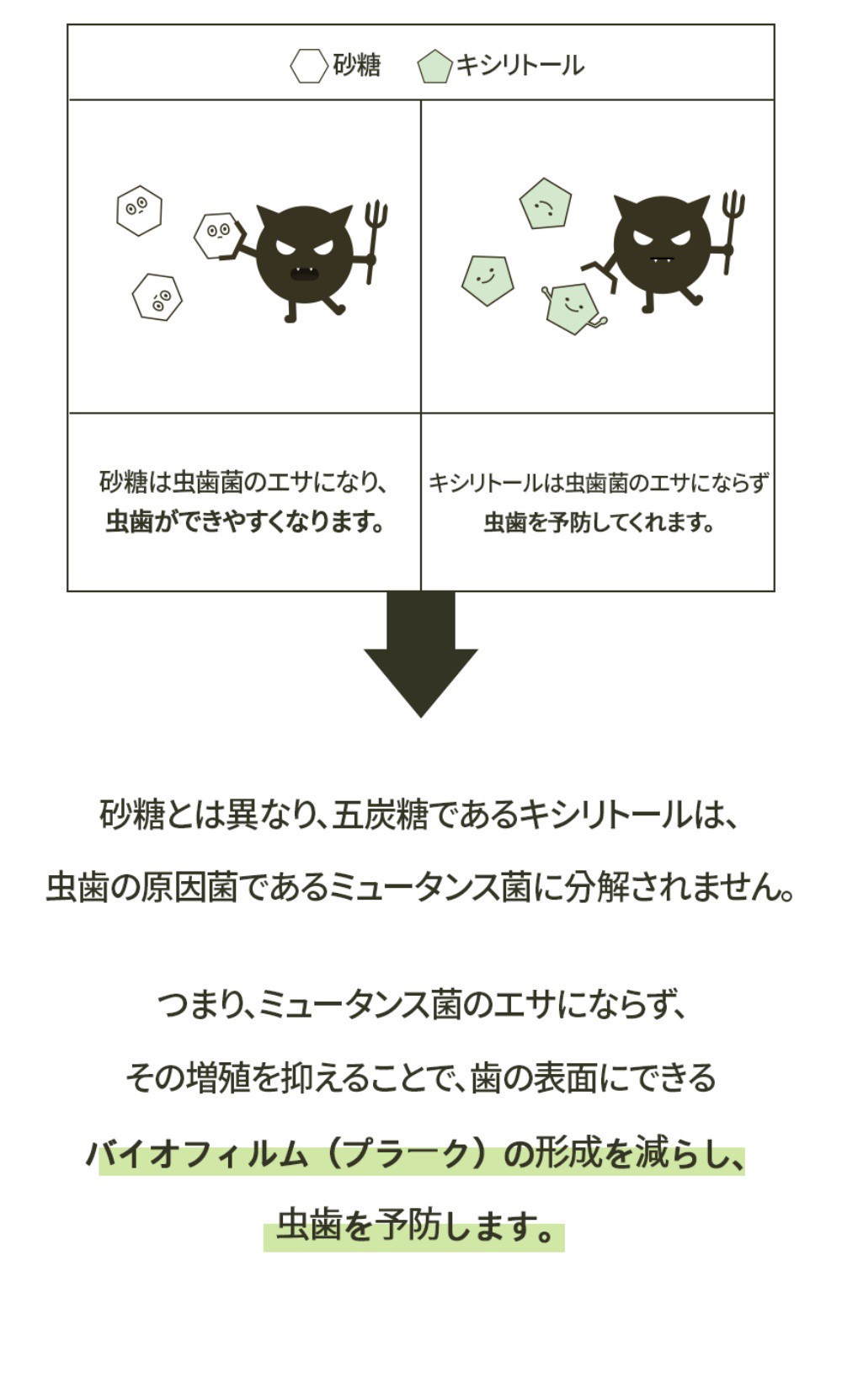 ・キシリトールはむし歯の原因菌に分解されにくいとされ、