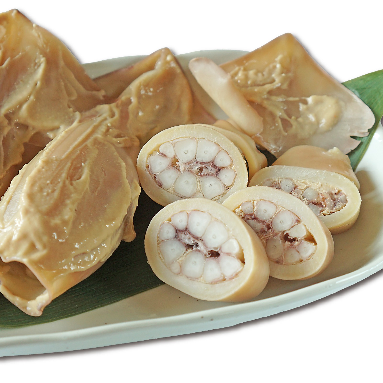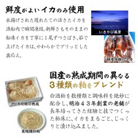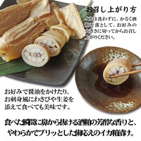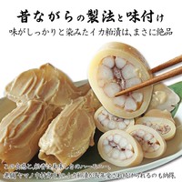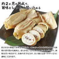 新鮮なイカを、鮮度を逃さずすぐに加工し、やわらかく茹で上げて使用。国産の熟成期間の異なる3種類の粕をブレンドした特製の粕床に丸ごと漬け込み、約2か月かけてじっくり熟成させました。酒粕は甘い味付けで上品な香り。イカ本来の旨味がしっとりと染み込んだ、昔ながらの味わいが楽しめます。食べた瞬間に鼻から抜ける酒粕の芳醇な香りと、やわらかでプリッとした歯応えが美味しい。醤油やわさび、生姜を添えても絶品です。