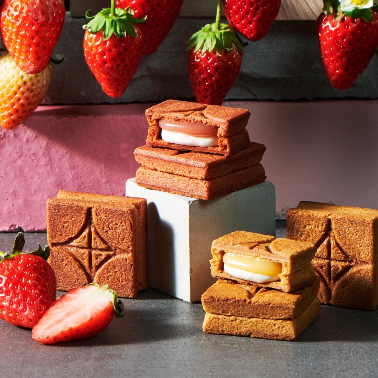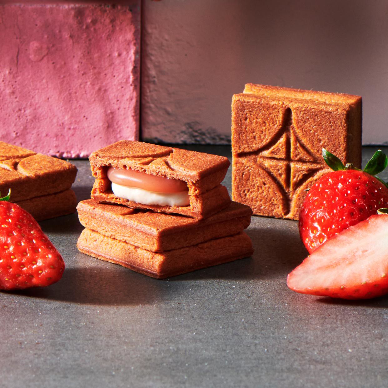 あまおう苺ジャムを練り込んだバタークリームと、あまおう苺の濃縮果汁を使用したバターキャラメルを、サクサクのクッキーにサンドしました。