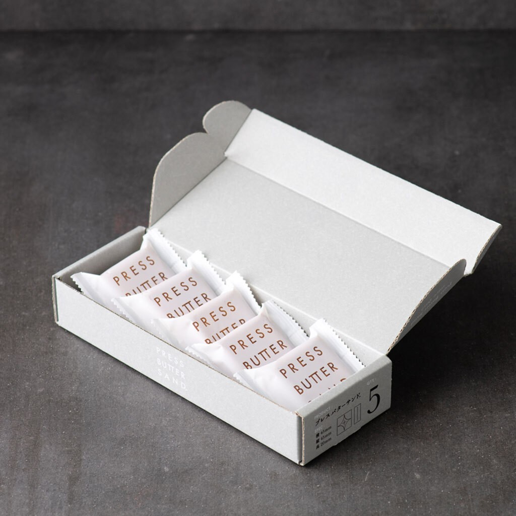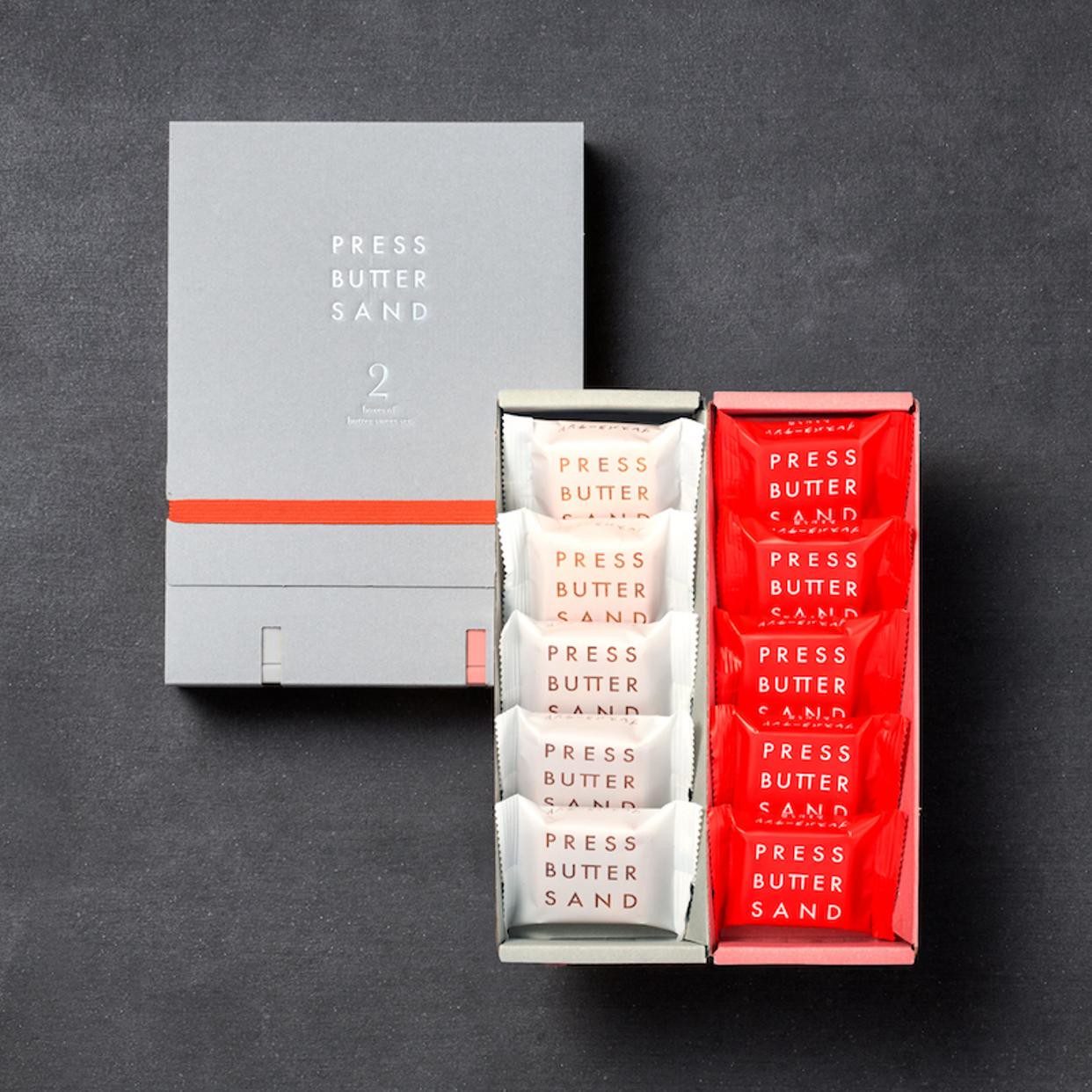 濃厚なバタークリームとなめらかなバターキャラメルをサクサク食感のクッキーで挟んだ「バターサンド」と、福岡県産あまおう苺をクリームとキャラメルに贅沢に使用した華やかな香りと甘酸っぱさの「バターサンド〈あまおう苺〉」 の2種類をセットにしてPRESS BUTTER SANDのロゴが箔押しされたオリジナルのスリーブに入れました。
