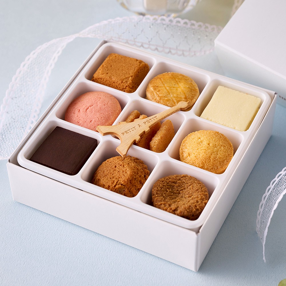 ■内容量:フロマージュ 4個、ショコラ・ノワール 4個、ショコラ・ブラン 4個、フレーズ 3個、サブレ・バニーユ 3個、プラリネ 2個、フランボワーズ 2個、ガレット・ブルトンヌ 2個、スペキュロス 2個
