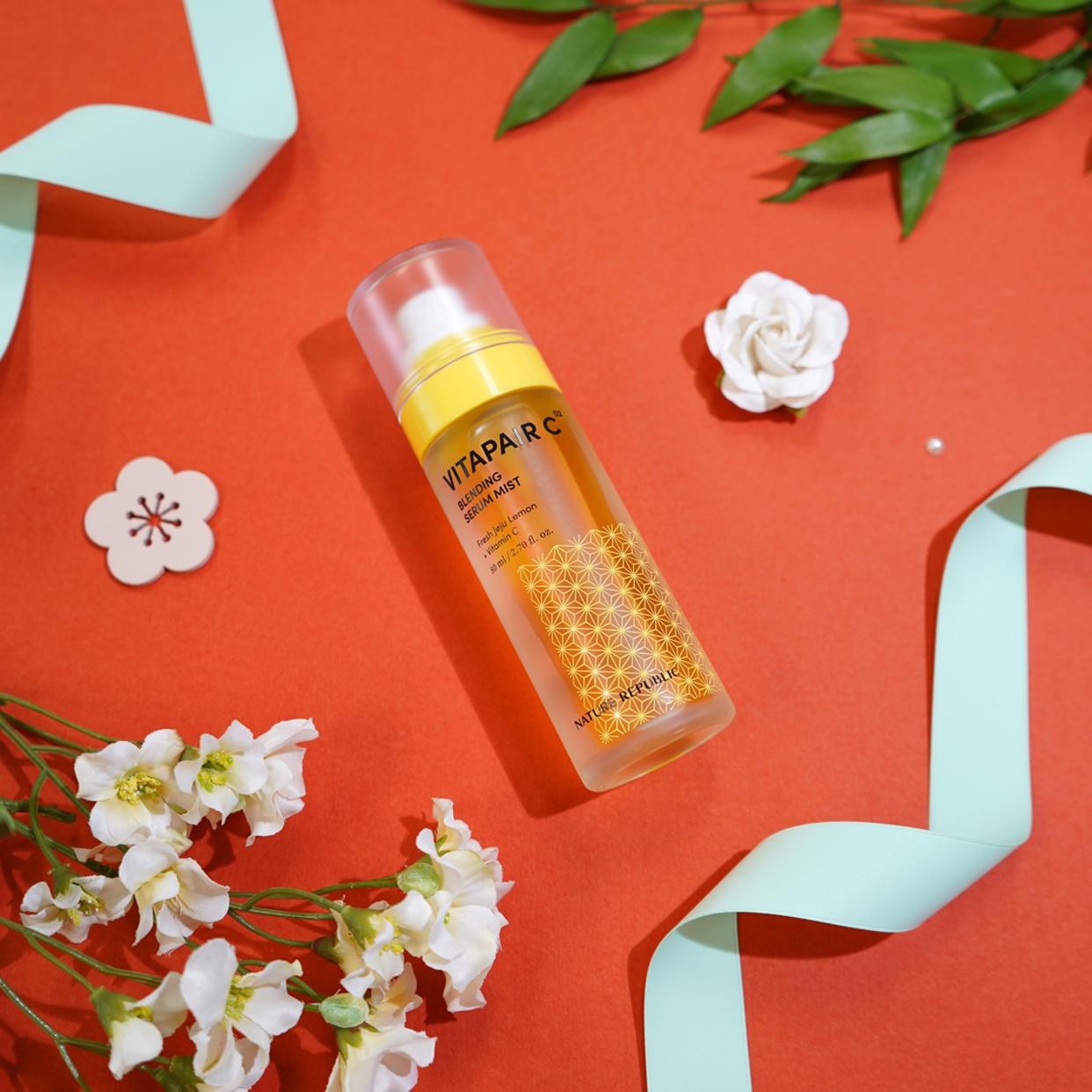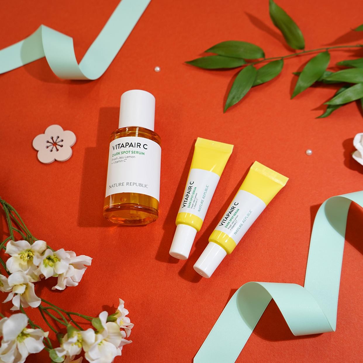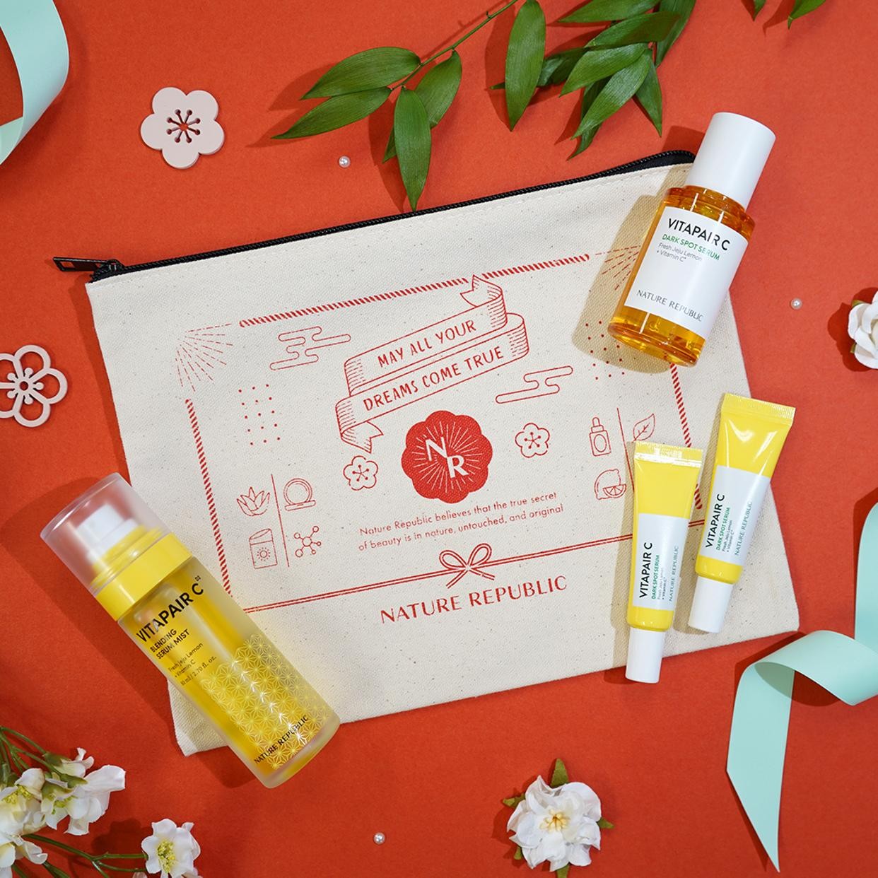 ネイチャーリパブリックのシグネチャーアイテムビタペアC集中美容液と、いつでもどこでもビタミン*チャージできるビタペアCセラムミストをセットにしたお祝いセット。