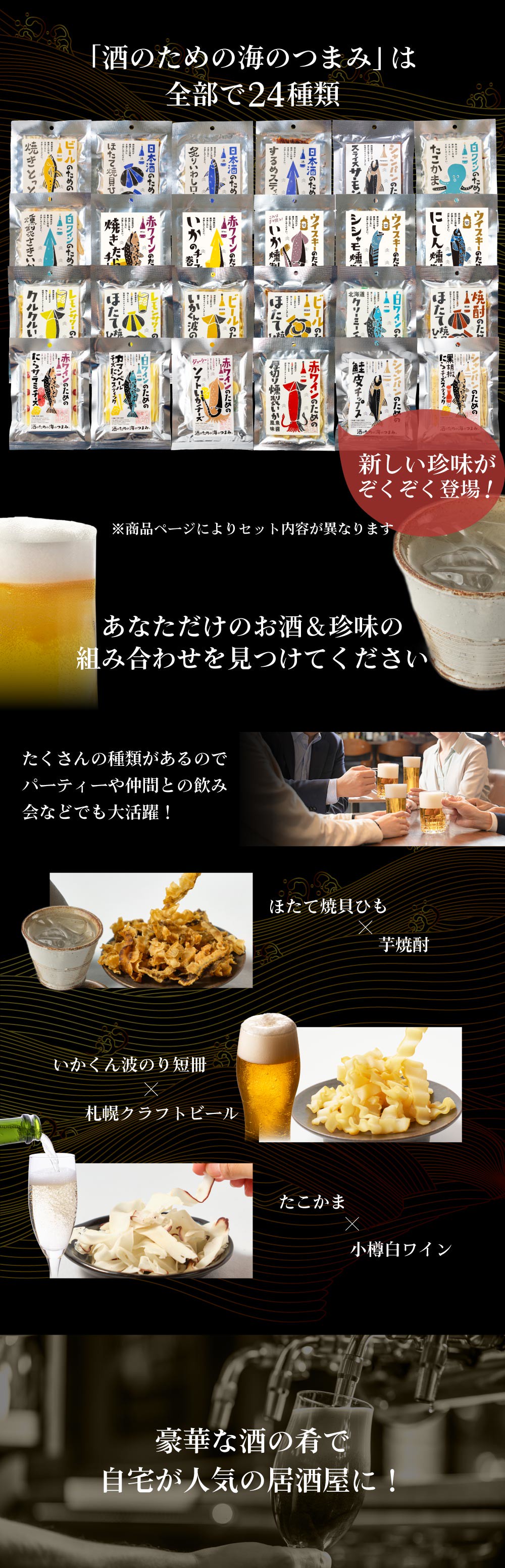 日本酒やビールはもとより、焼酎、白ワイン、赤ワイン、ウイスキーにもピッタリの珍味をセレクトしました。