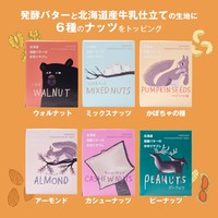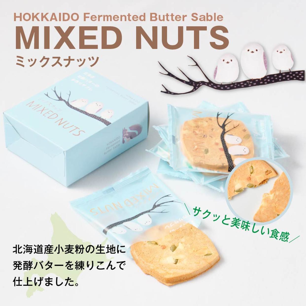 小麦粉(小麦(北海道産))、砂糖(甜菜(北海道産))、バター(乳成分(ベルギー産))、鶏卵(北海道産)、落花生(南アフリカ産)、カシューナッツ(インド産)、クルミ(アメリカ産)、かぼちゃの種(中国産)、アーモンド(アメリカ産)、牛乳(生乳(北海道産))、食塩(国内製造)/膨張剤、(一部に小麦・落花生・カシューナッツ・クルミ・アーモンド・乳成分・卵を含む)