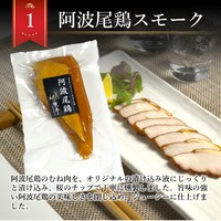 徳島県産地鶏・阿波尾鶏むね肉のスモーク、阿波尾鶏パストラミ、阿波尾鶏ソーセージの3種の燻製セット。お父さんのおつまみはもちろん、お歳暮・お中元などのギフトにも最適です。