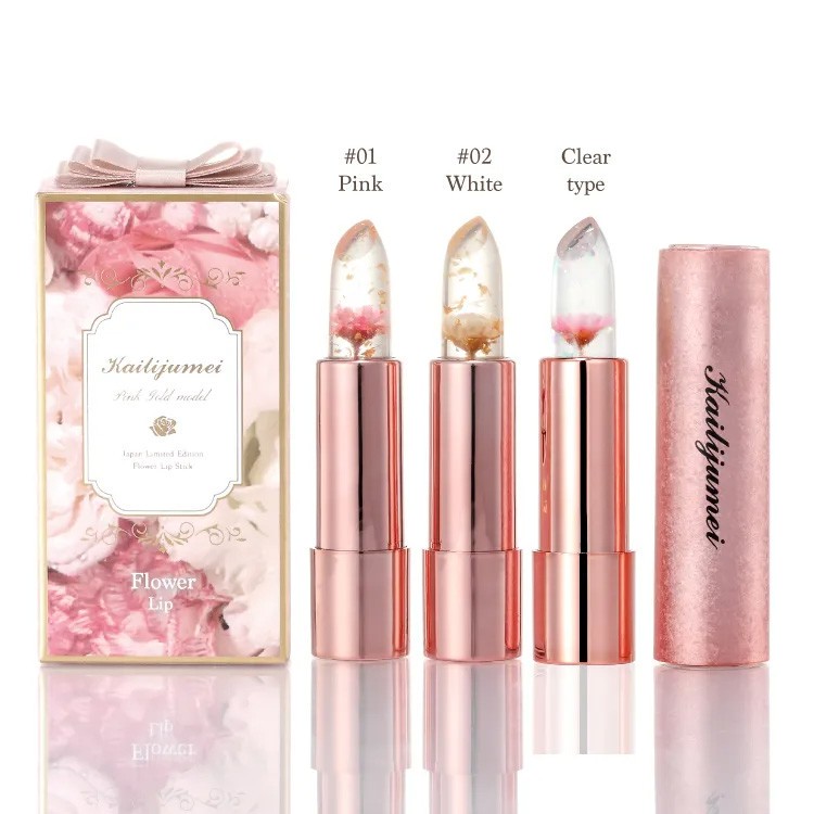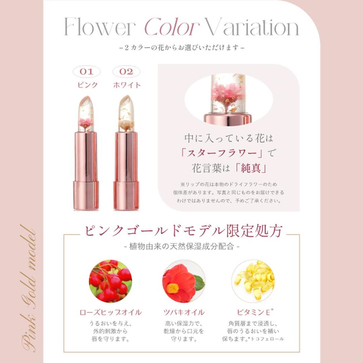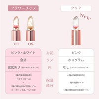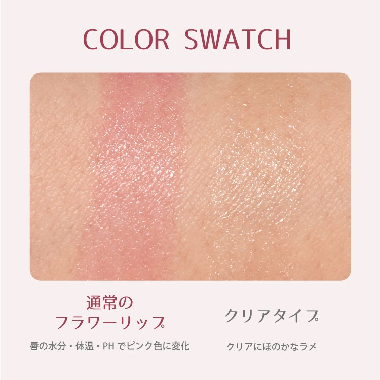 体温やpHで色が変化するフラワーリップ「ピンク」「ホワイト」、色がつかない「クリアタイプ」の3種類からお選びいただけます。