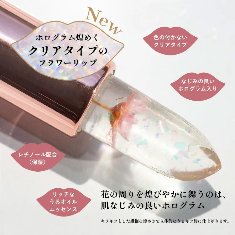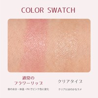 クリアタイプは、pHで色が変化するマジックカラーの既存品とは異なり、ケアに特化した色が付かないフラワーリップです。ベタつき感のない軽やかな塗り心地で日中のケアはもちろん、ナイトケアとしても24時間使用できます。