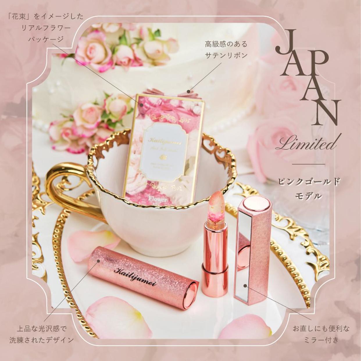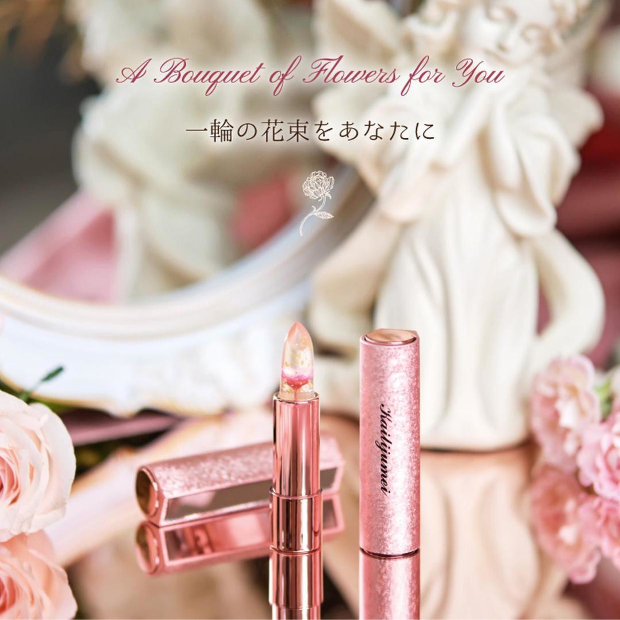 また、お花の開き方、色味が一輪、一輪異なる本物のドライフラワーと金箔を中に閉じ込めた、あなただけのたった一つのフラワーリップです。