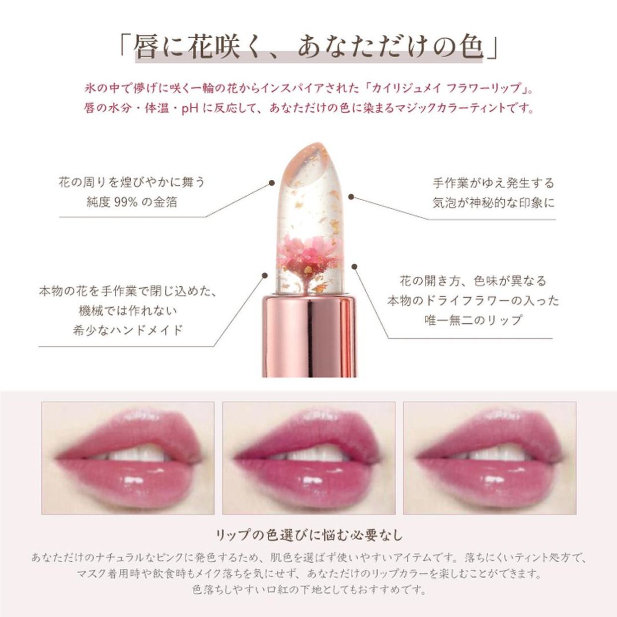 フラワーリップは見た目は透明のリップなのですが、唇に塗ると、自分の体温やpHによって色が変化する不思議なリップです。