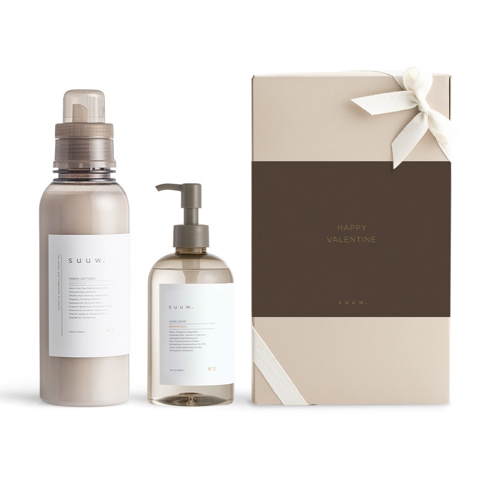 suuw.の中でも人気な「N°2 オスマンサス」「N°5 サンダルウッド」の柔軟剤とハンドソープのセットです。(どちらも同じ香りでお届け)オリジナル紙箱に、チョコレートカラー×ゴールドロゴの紙帯とコットンリボンをかけてお送りします。紙帯は高級感のあるラフな質感です。