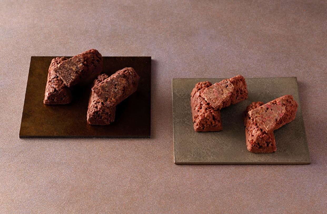 カカオのビター感が香るチョコレートに、⾷感を演出するプラリネ、フイユティーヌ、クッキーを練り込み、仕上げにほろ苦いココアをまとわせました。
