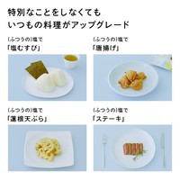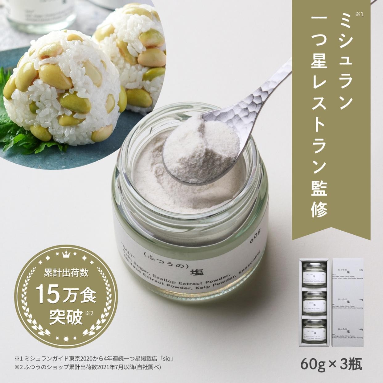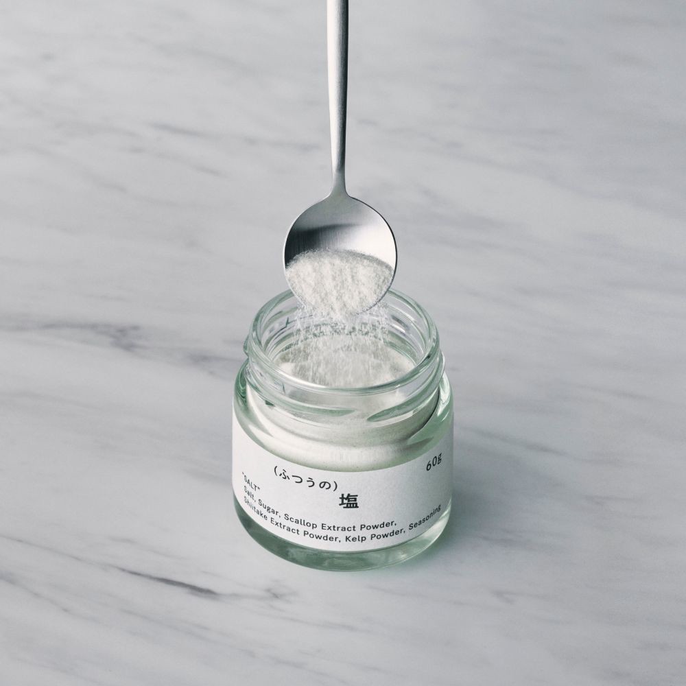 通常、塩は素材の輪郭をはっきりとさせる役割を持っていますが、「(ふつうの)塩」は、塩味、うま味、甘味を程よいバランスで調合しているため、素材の輪郭を優しく浮かび上がらせながらうま味も底上げし、食材を二重に引き立てます。「(ふつうの)塩」は味に深みのある洗滌天日塩をベースに昆布やホタテといったうま味成分を調合しています。肉や魚、おにぎりや揚げ物など食材を選ばず様々なお料理にお使いいただけます。