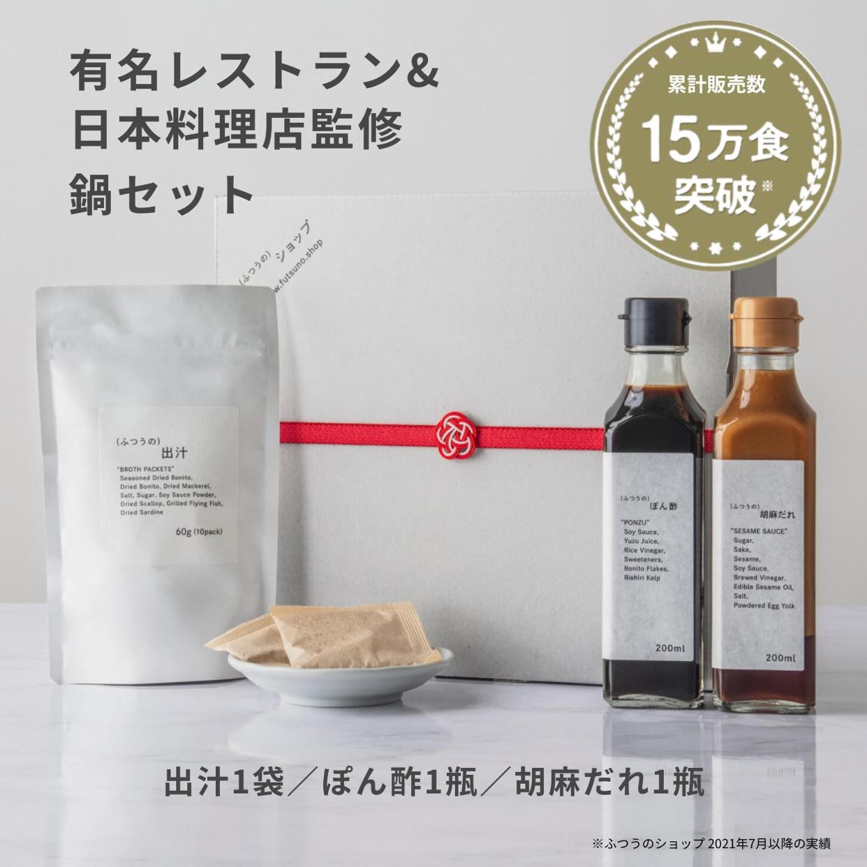 【内容】出汁1袋(6g×10)、ぽん酢1瓶(200ml)、胡麻だれ1瓶(200ml)