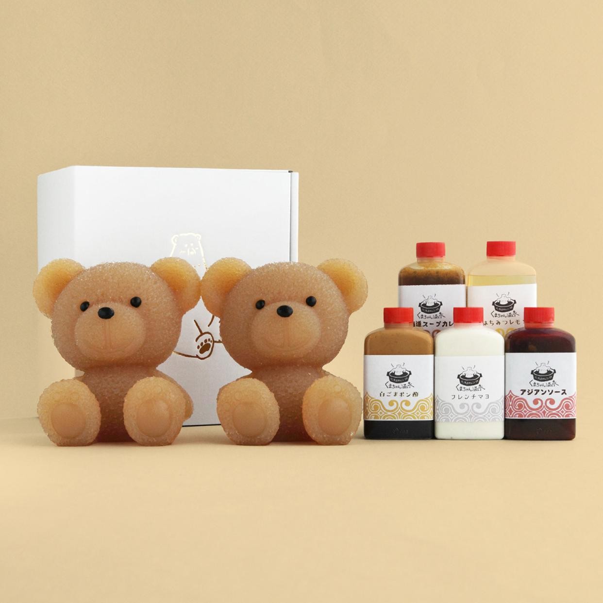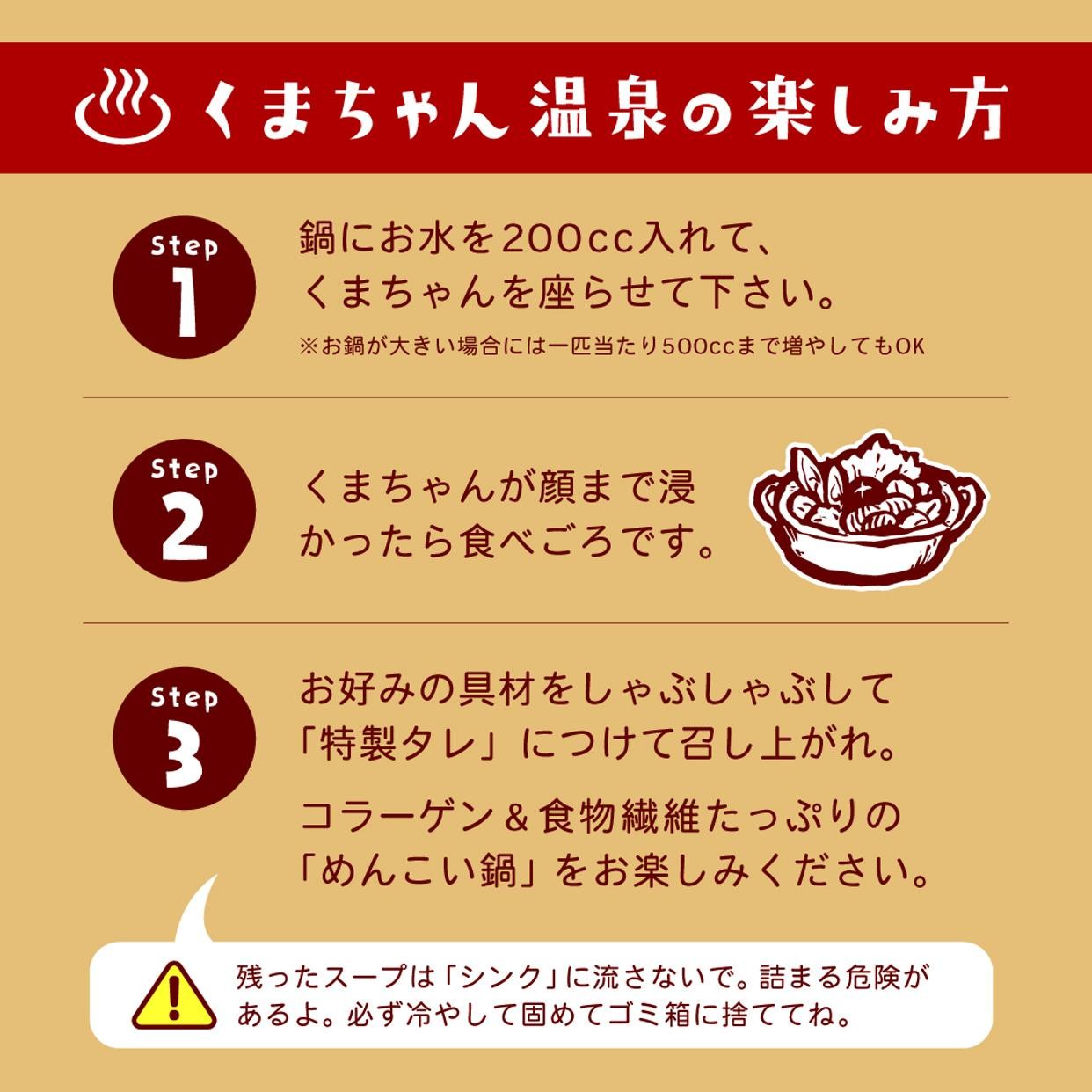 当店一番人気黄金の湯「出汁醤油風味(鰹だし)」の茶くま2匹ペアセット。くまちゃん1匹でのご入浴には1~2人用の小さめ鍋がぴったり。2匹一緒にご入浴は3~4人用の鍋でお召し上がりいただけます。