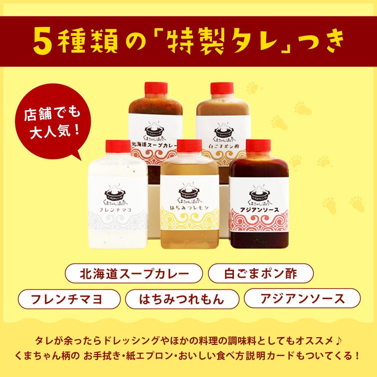 お手持ちのポン酢などに加え、くまちゃん温泉特製の5種タレで味の変化も楽しんで!