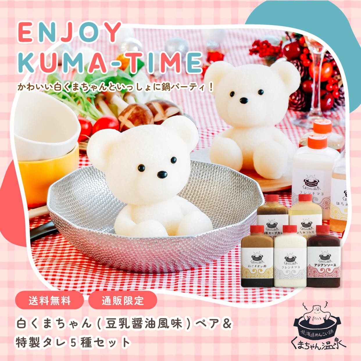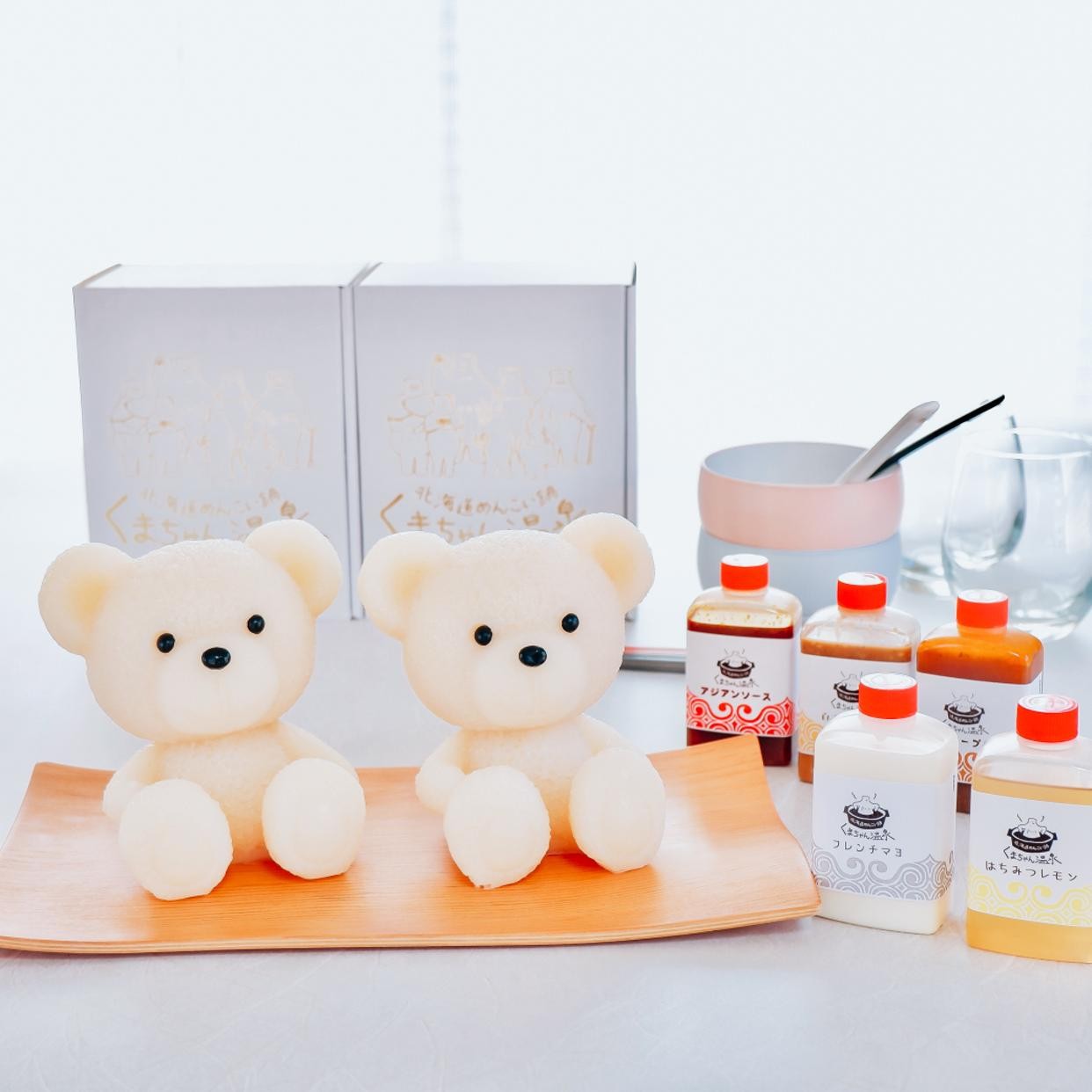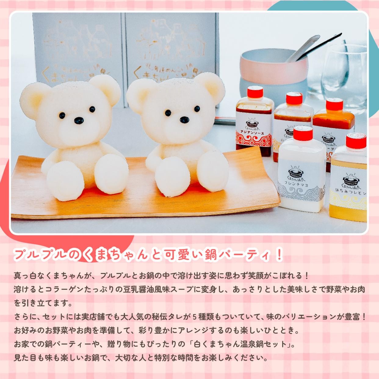 癒しの湯「豆乳醤油風味」の白くま2匹のペアセット。くまちゃん1匹でのご入浴には1~2人用の小さめ鍋がぴったり。2匹一緒にご入浴は3~4人用の鍋でお召し上がりいただけます。