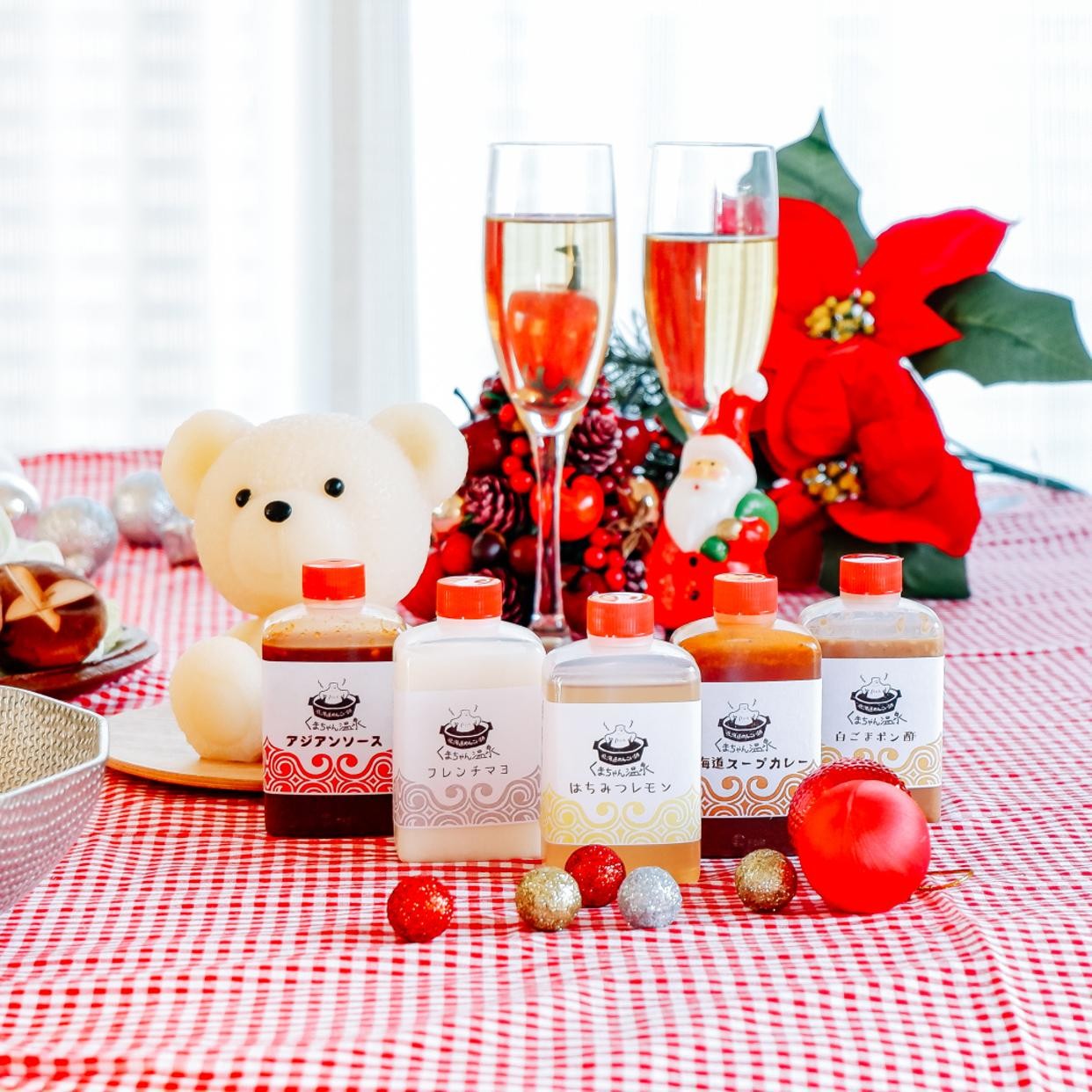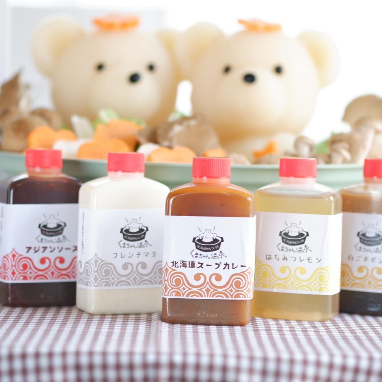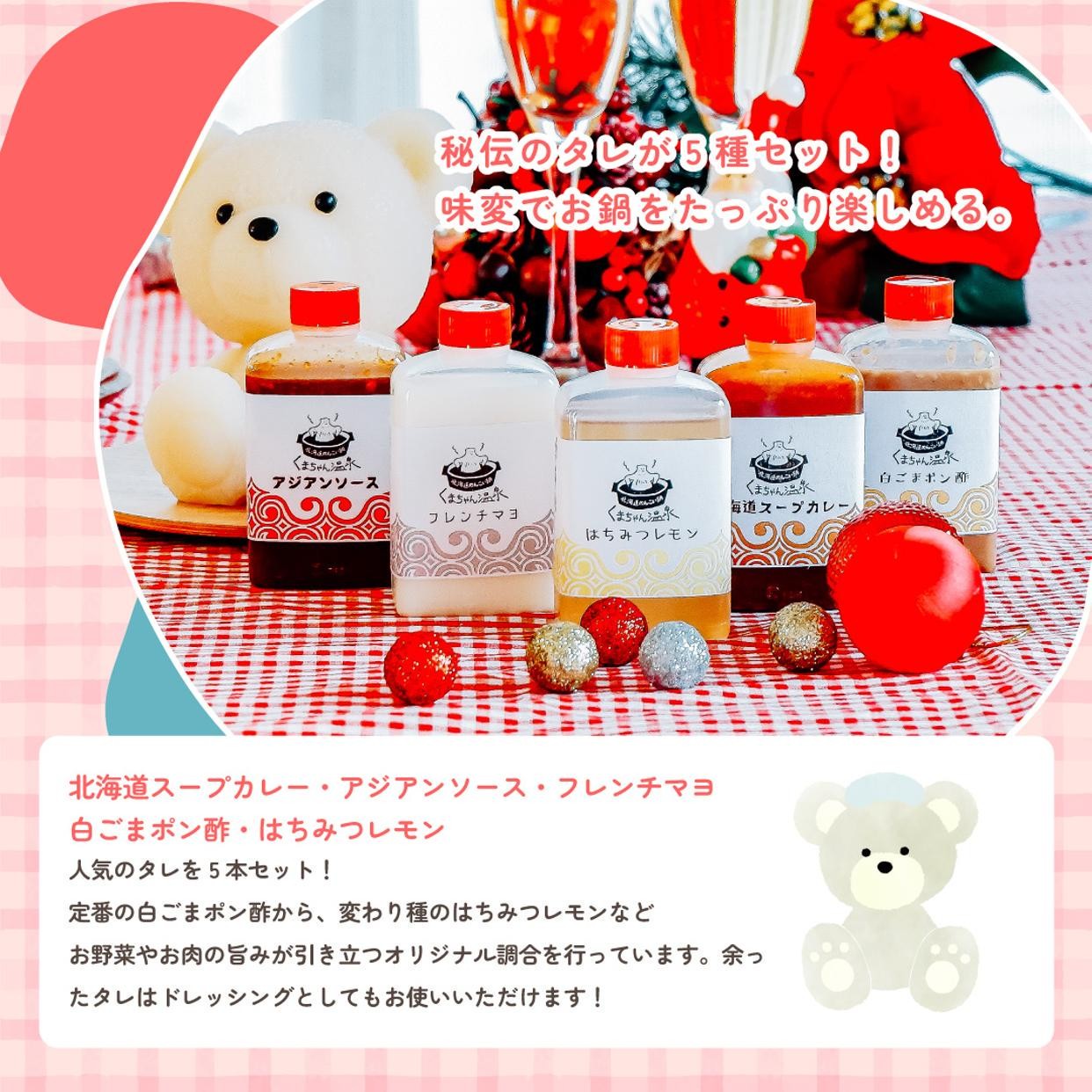 くまちゃんをお鍋の中に入れて温めてあげると、ユラユラと揺れてとけだし…まるでくまちゃんが気持ちよく温泉に入っているよう!ベースは豆乳醤油風味のスープです。お手持ちのポン酢などに加え、くまちゃん温泉特製の5種タレで味の変化も楽しんで!