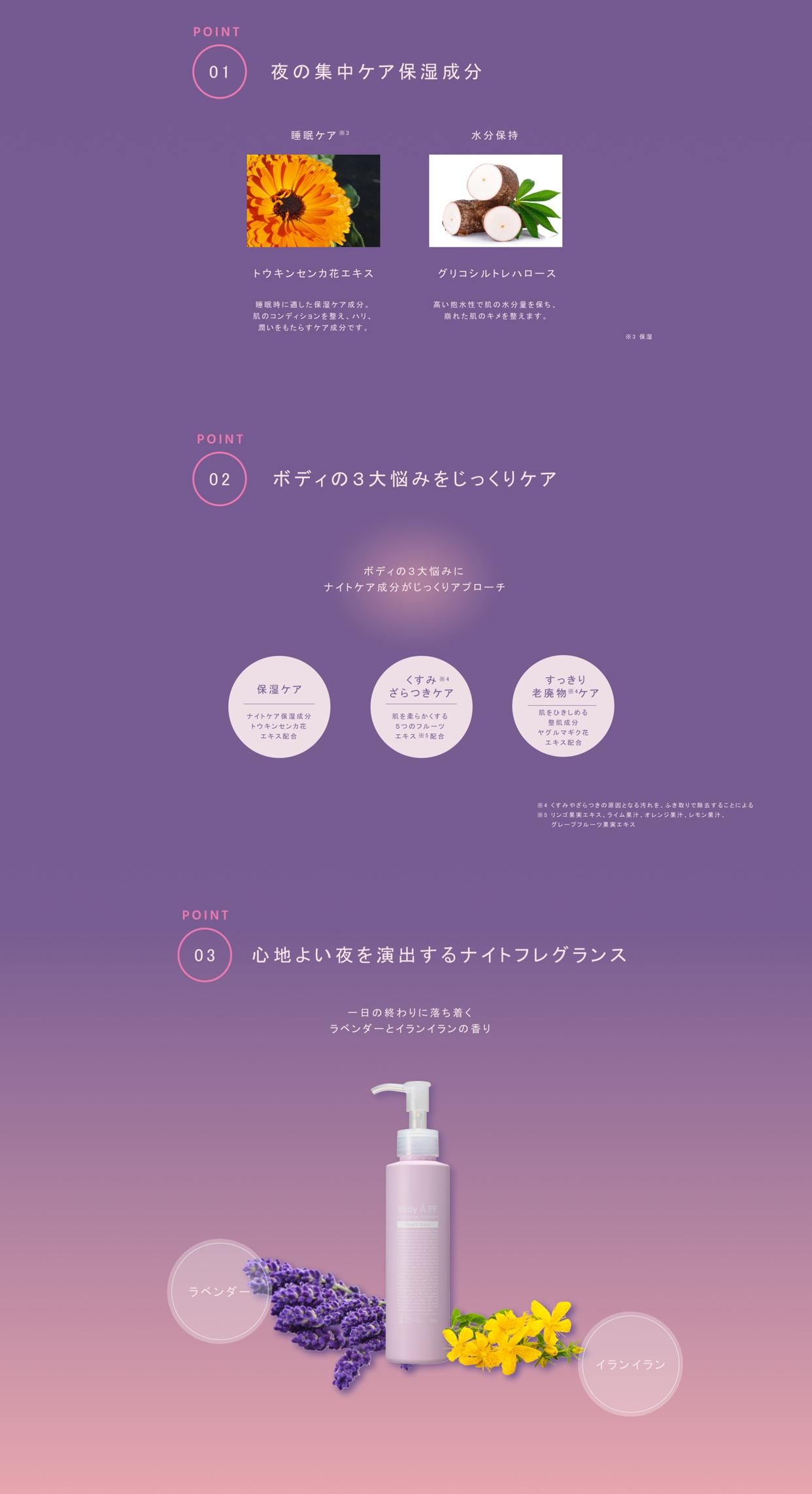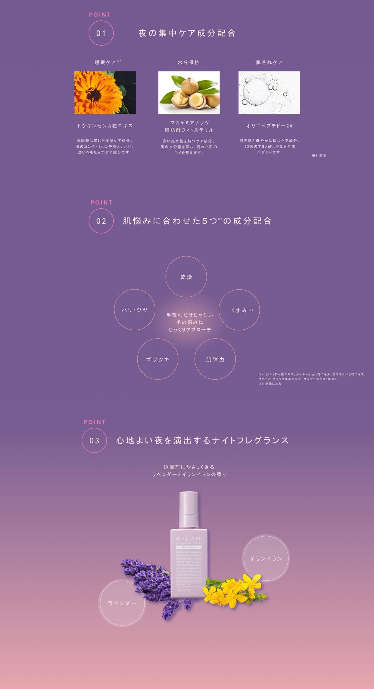 心地よい夜を演出するラベンダーとイランイランの香りで、お手入れ時間が心地よい時間へ。