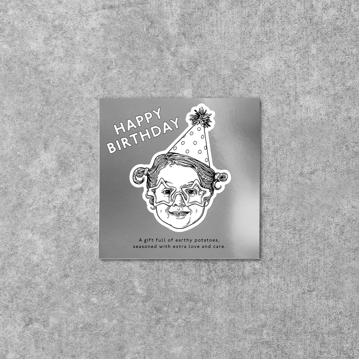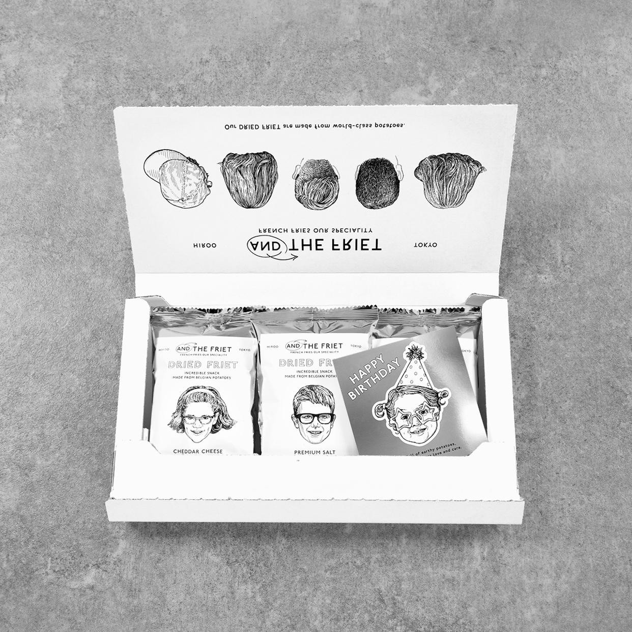 ポスト投函が可能な専用の薄型ボックスに、ミニサイズのドライフリット3種類と「HAPPY BIRTHDAY」のメッセージカードがセットされています。