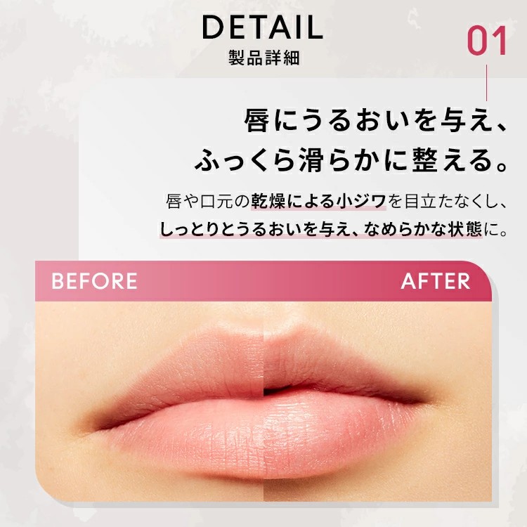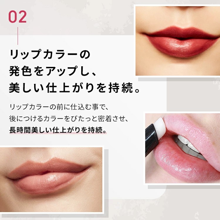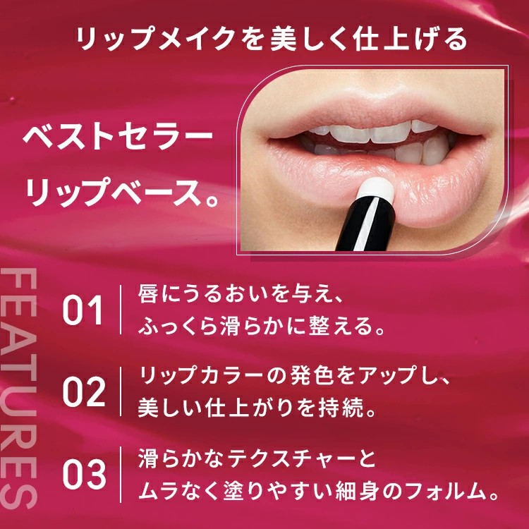 唇を保湿し滑らかに整え、カラーを均一に発色させるリップベース。リップカラーの前に仕込む事で、後につけるカラーをぴたっと密着させ、長時間美しい仕上がりを持続させます。