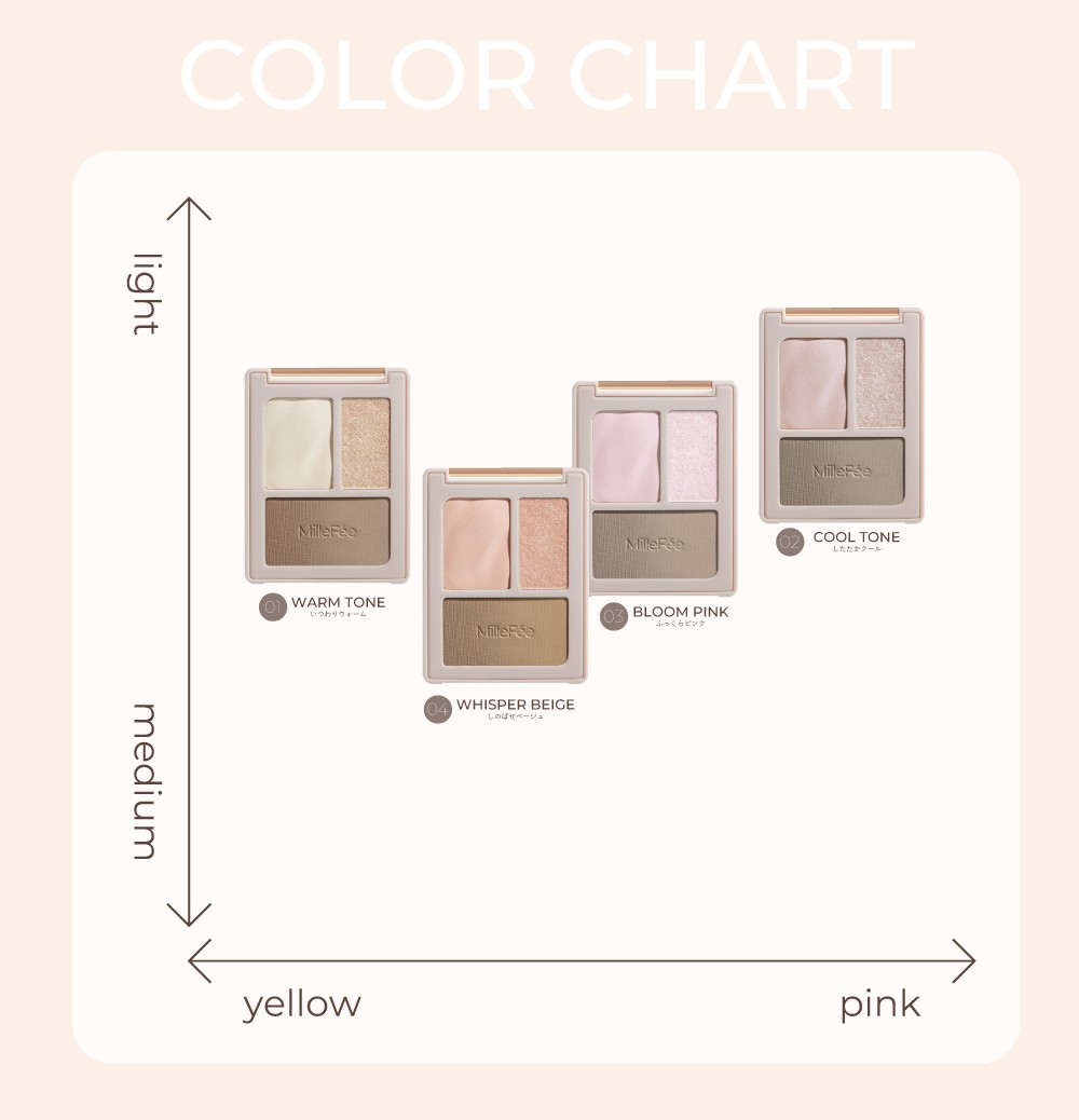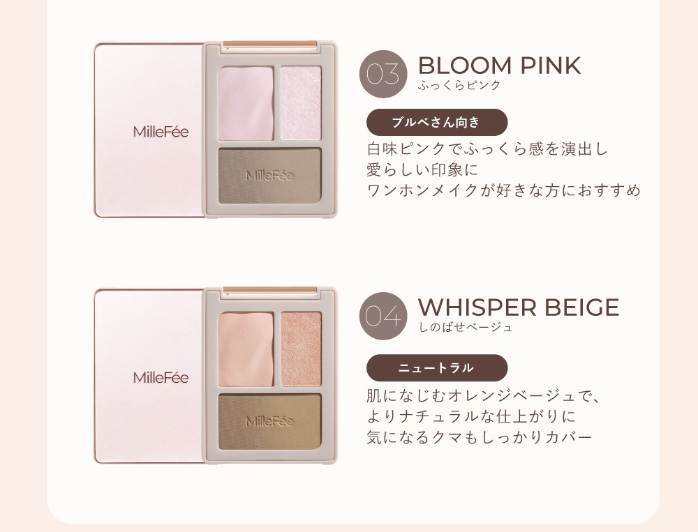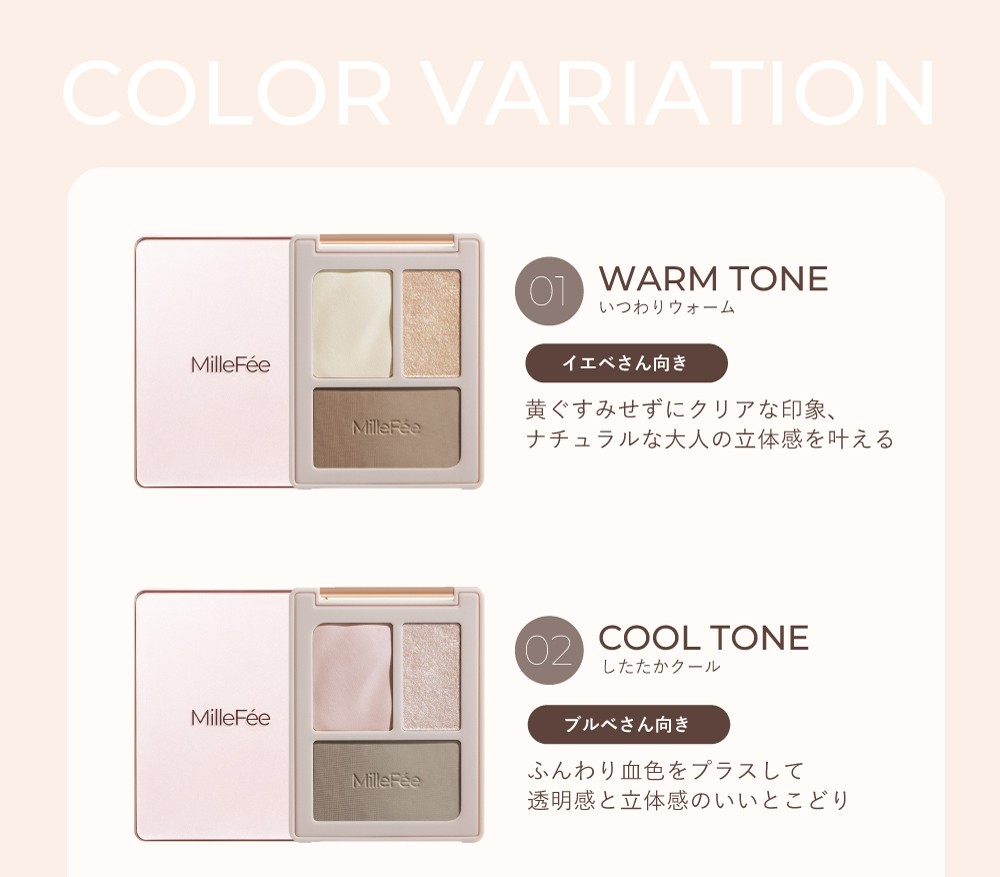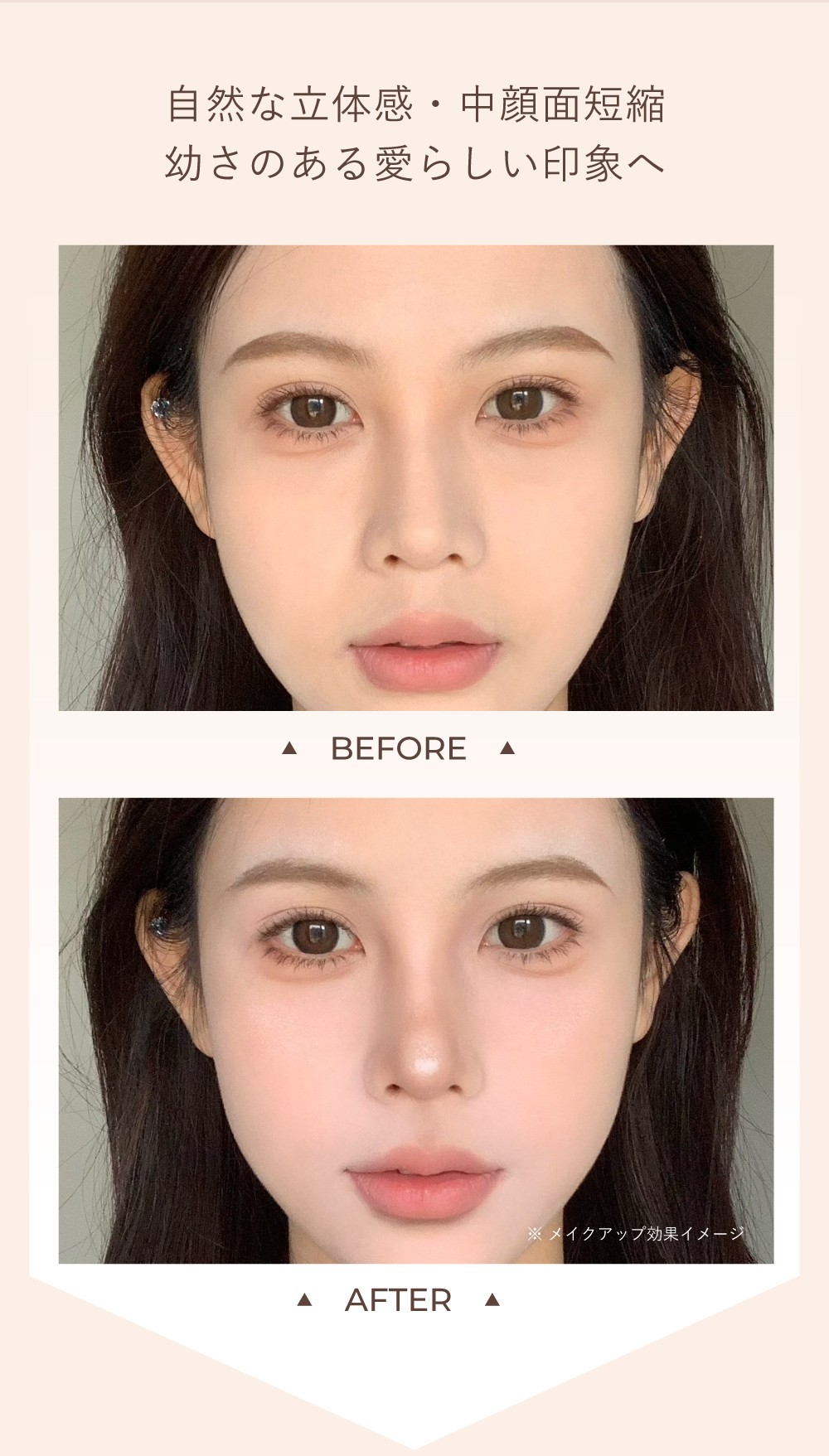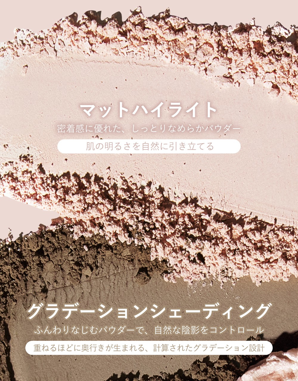 【使用方法】適量を指やパフにとり、陰影をつけたい部分や立体感を出したい部分に塗布してください。マットハイライト:ほうれい線、額、こめかみ、目の下など、くぼみが気になるところに。グロウハイライト:頬、鼻筋、口上、あご先など、立体感・ツヤがほしいところに。グラデーションシェーディング:フェイスライン、鼻筋、生え際など、すっきり見せたいところに。