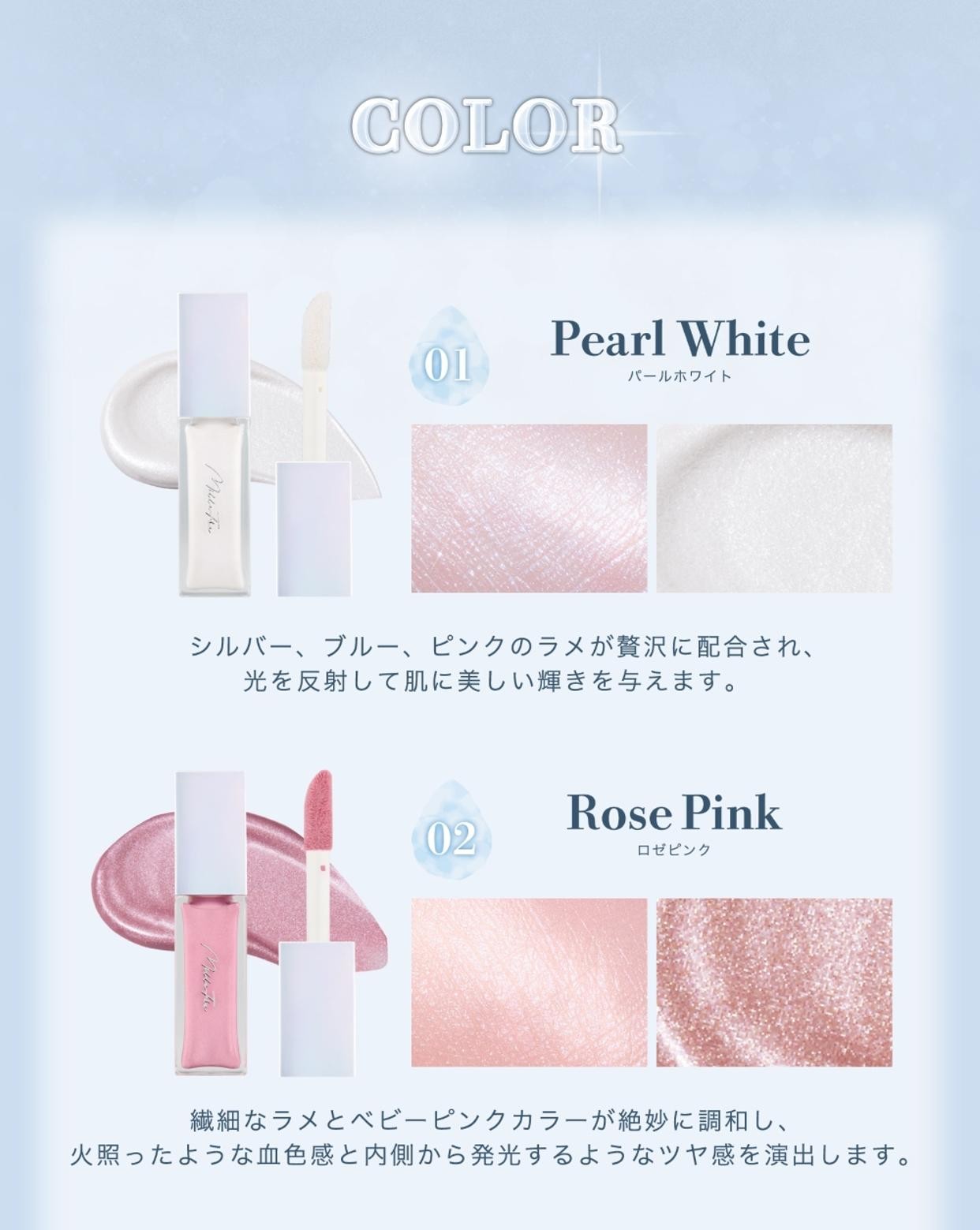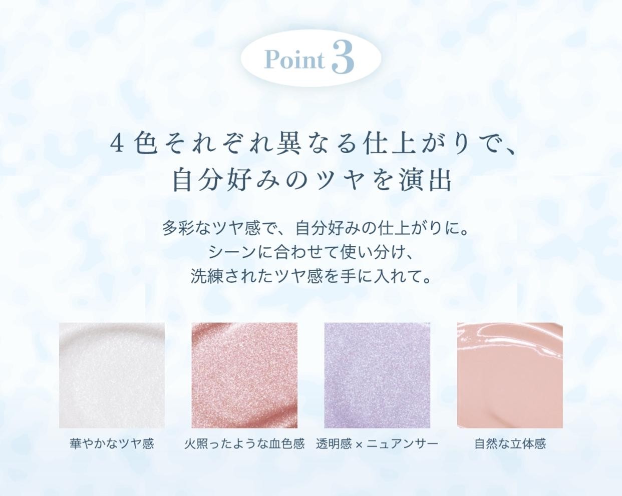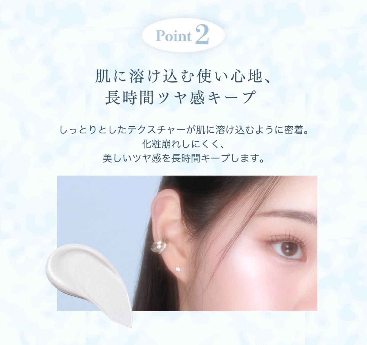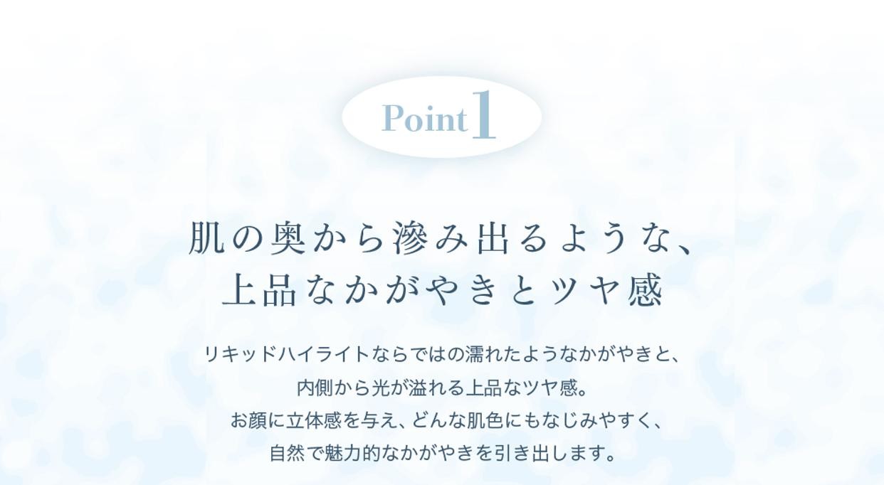 まるで内から発光しているようなジュワッとツヤめく透明感を演出する液体ハイライト肌の奥から滲み出るような、上品なかがやきとツヤ感を演出。