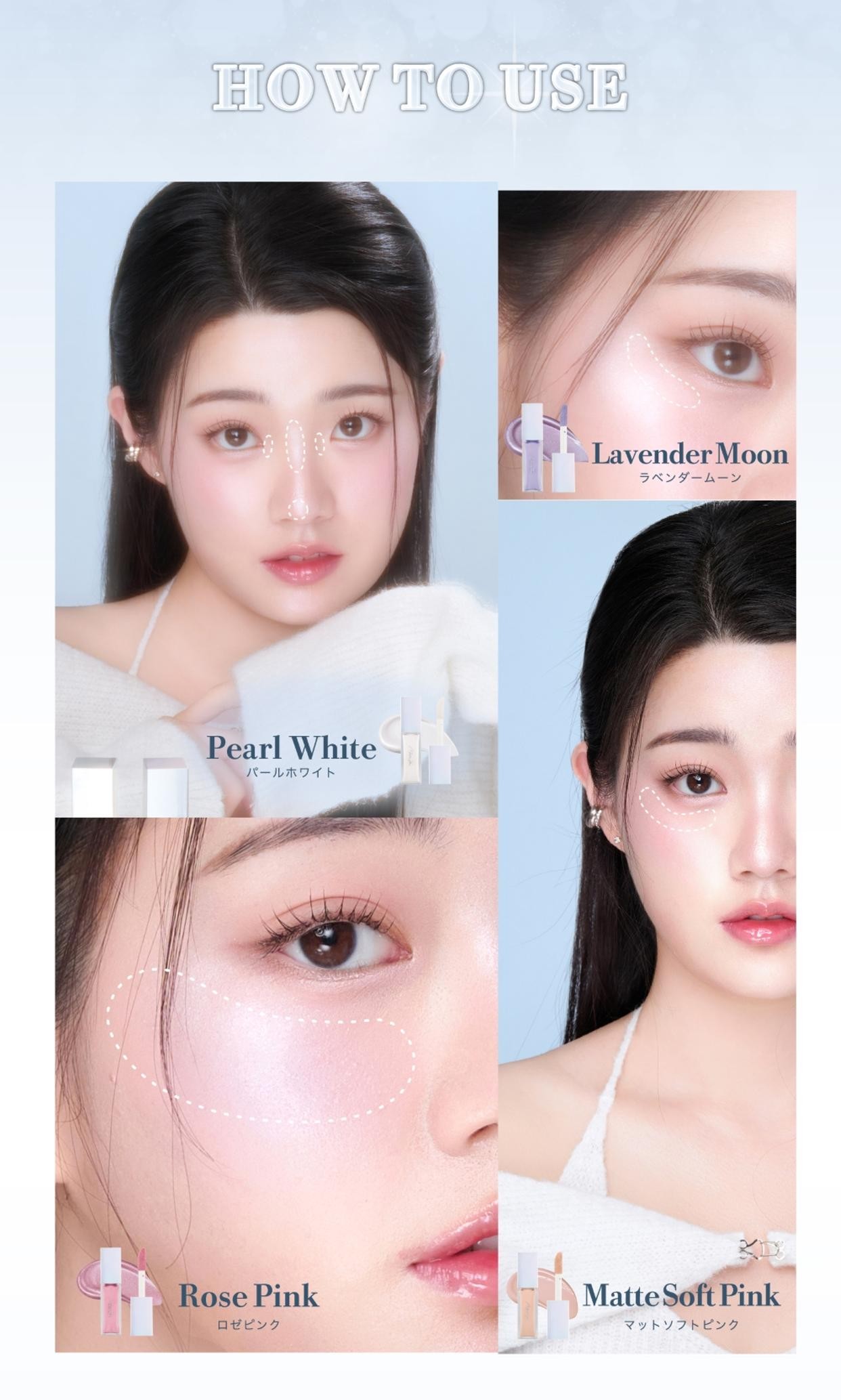 血色感や透明感をかなえるチークやニュアンサーとしても使えるカラー展開。マットハイライトはまるで本物のツヤのような自然な仕上がりへ。