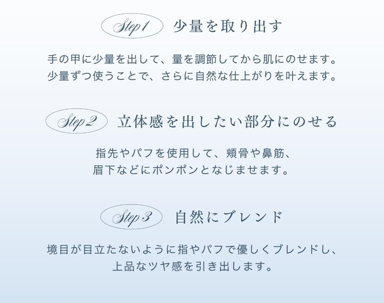 付属のチップに適量をとり、頬などの立体感を出したい部分に塗布してください。