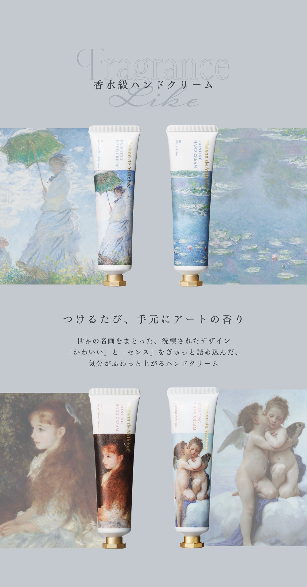 「Artistry in Care〜世界の芸術を手元にまとう〜」世界の有名絵画をモチーフにしたパッケージで、爪先まで美しく香る香水級ハンドクリーム