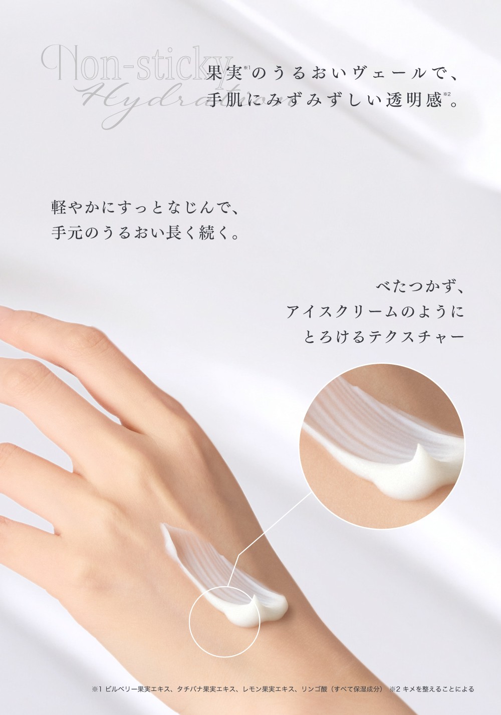 適量を手にとり、手全体をマッサージするようになじませてください。