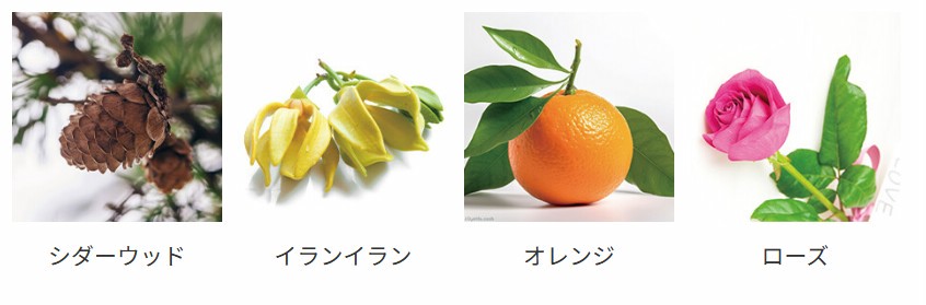 *1 ジュニペルスメキシカナ油 *2 イタリアイトスギ葉/実/茎油 *3 イランイラン花油 *4 オレンジ花油 *5 ダマスクバラ花油