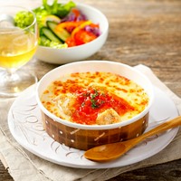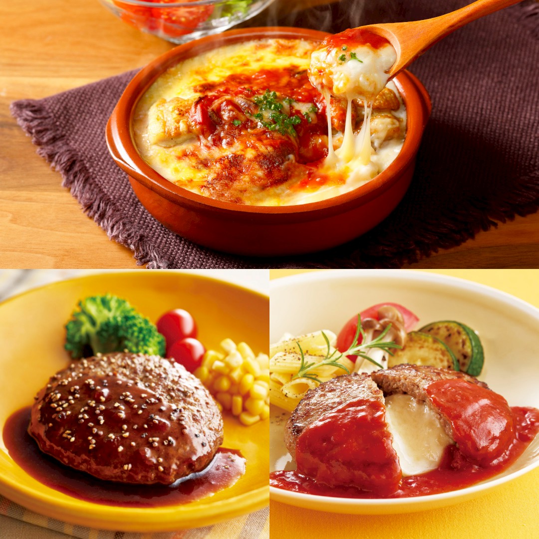 酸味を抑えることでまろやかさを感じられるトマトソースと、新たに北海道産ゴーダチーズを加え5種類のブレンドとなった深みのある濃厚なチーズはハンバーグとの相性抜群です!焼き上がりの中からあふれるチーズをお楽しみください。