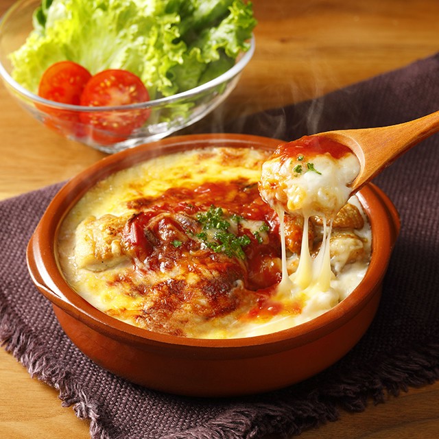 コクのあるホワイトソースと酸味の効いた特製トマトソースがとろ~り濃厚チーズと相性抜群。