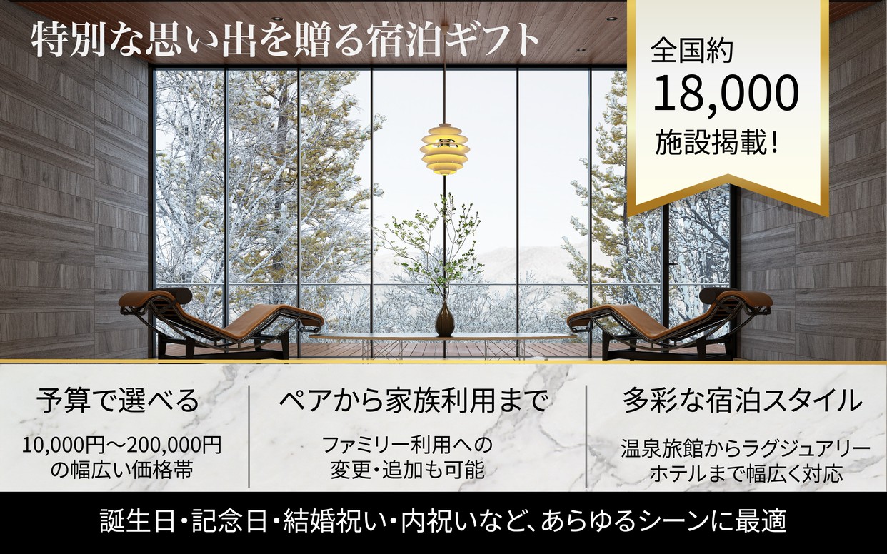 人生の節目を迎える大切な方への贈り物として、全国約18,000軒のホテル・旅館から選べる宿泊ギフトカードはいかがでしょうか。長年のご苦労への感謝の気持ちを込めて、温泉旅館での癒しのひとときや、上質なホテルでのゆったりとした時間をプレゼント。受け取った方がお好きな時期に、お好きな場所を選んで旅行を楽しめるので、「何を贈ろうか迷ってしまう」という心配もありません。人生の新たなスタートを祝う、心に残る贈り物です。