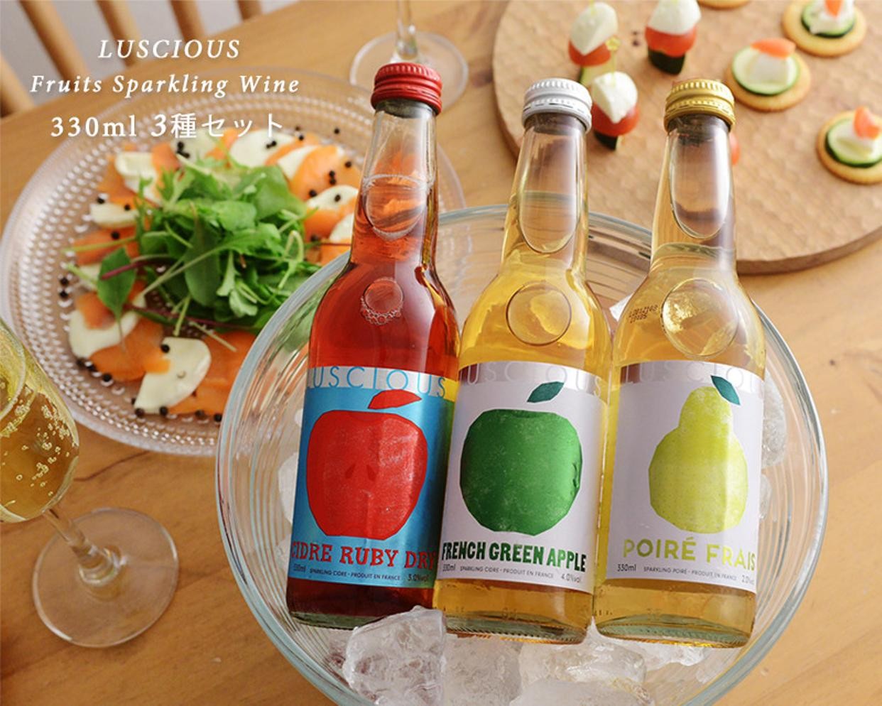 香料・砂糖・甘味料を添加せず、果実そのものの美味しさを楽しめるスパークリングワインとシードルの3種セット。色とりどり、食卓を華やかに演出してくれます。