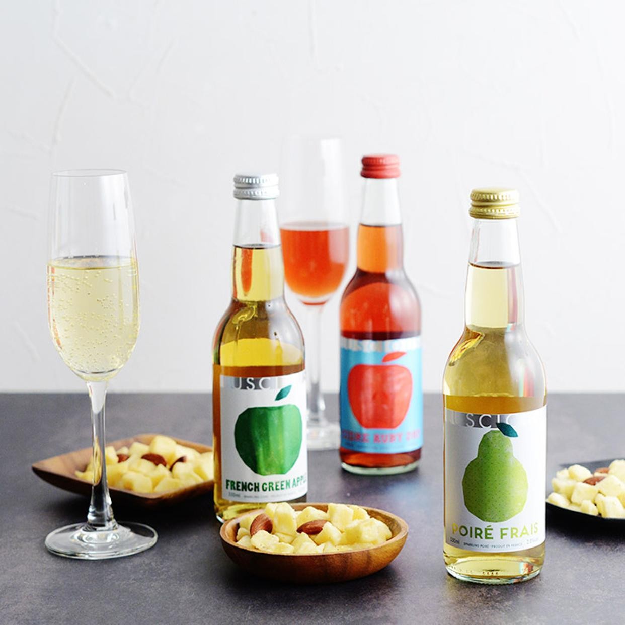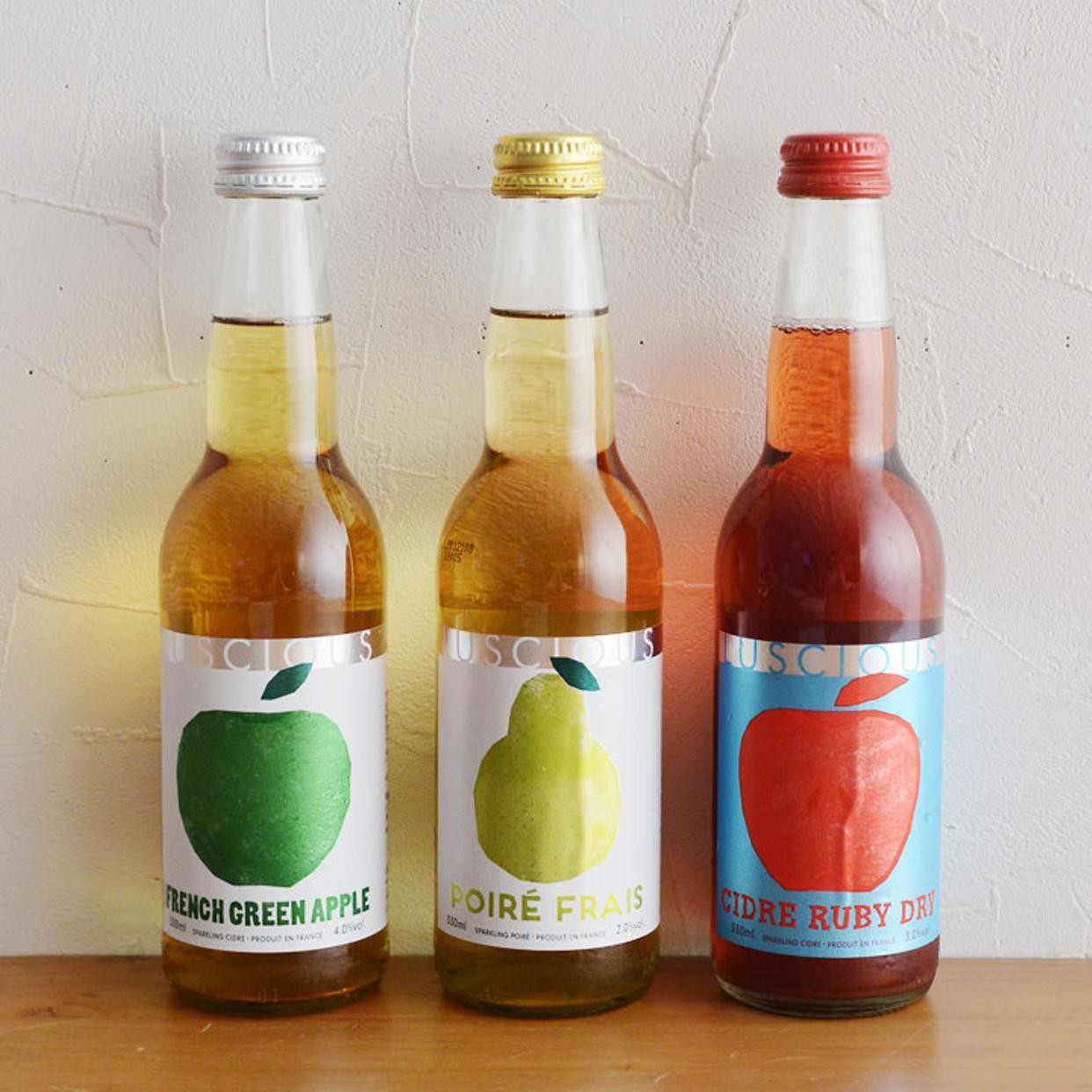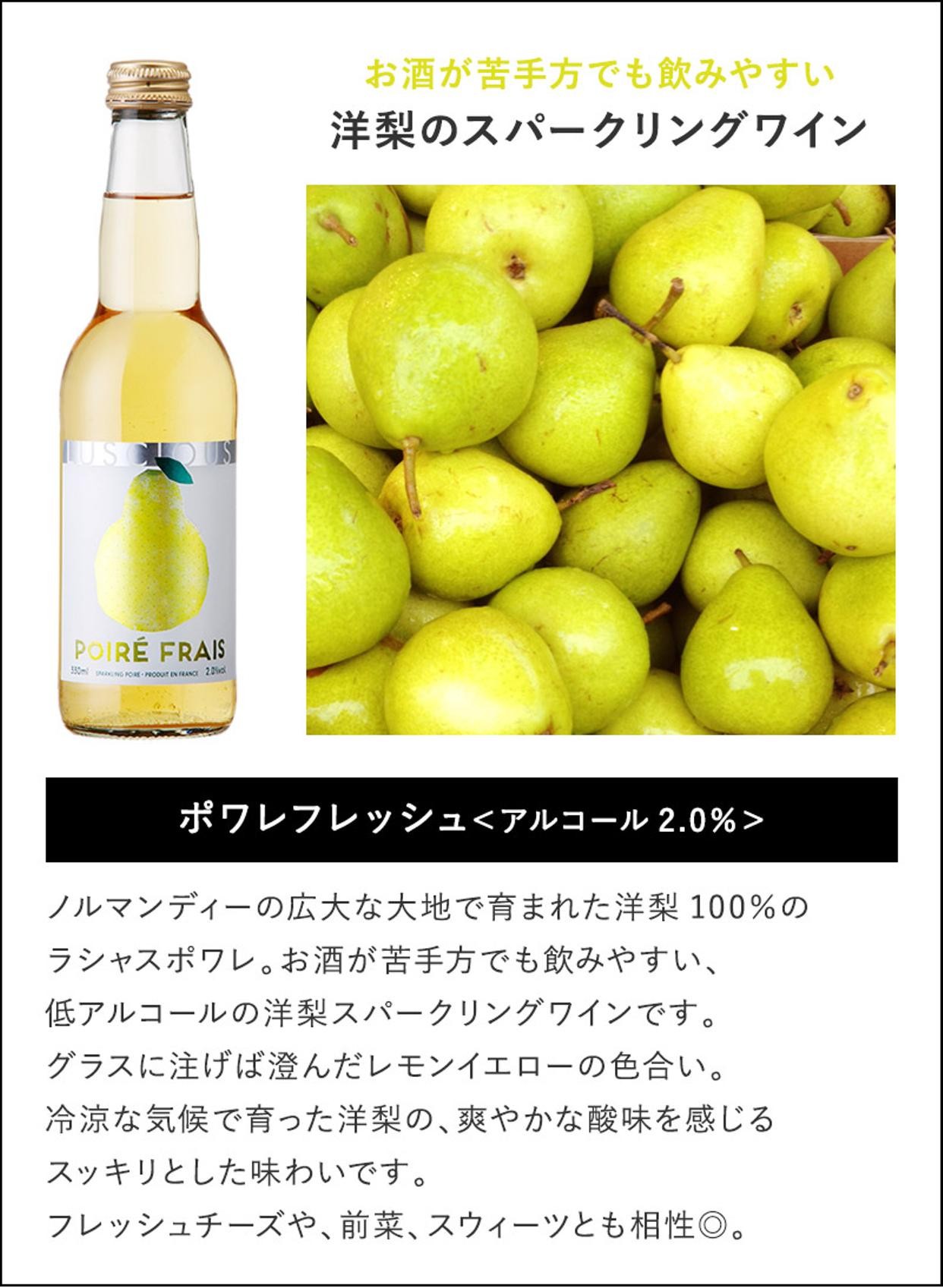 香料・砂糖・甘味料を添加せず、果実そのものの美味しさギュッと閉じ込めた、3種類のスパークリングワイン。洋梨100%ポワレ、青リンゴ100%のシードル、果肉まで真っ赤な林檎100%のシードル・・・