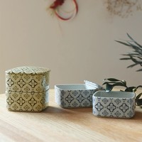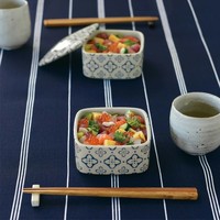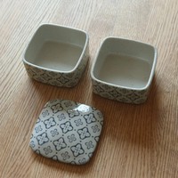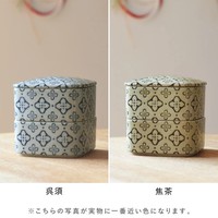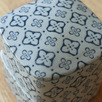つるりとした質感が上品な、陶器のお重に描かれた花模様。一見すると日本伝統の吉祥模様のようで、よく見るとまるで海外のタイル模様のようでもある、オリジナルのデザインです。