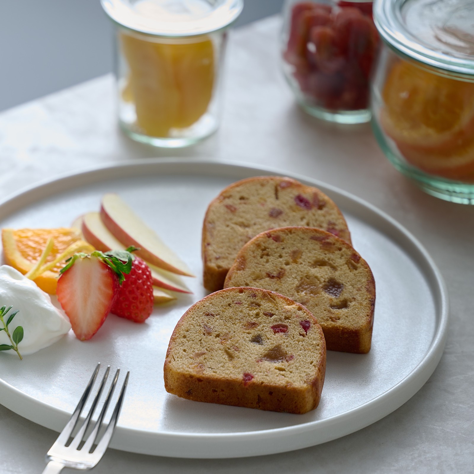 7種類のフルーツを洋酒に漬け込み、紅茶の生地でくるんだ、フルーツが詰まったパウンドケーキ。ひとくち食べ進めていくごとに、7種のフルーツそれぞれの味わいを楽しめる、ホテルシェフならではのデザートに仕上げました。