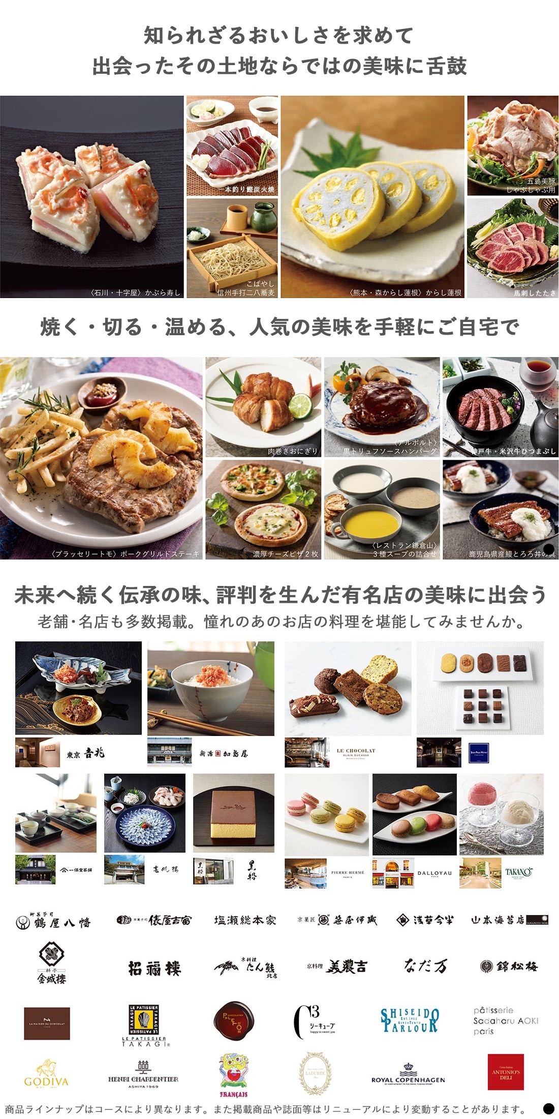 老舗・名店の美味、四季折々のバラエティーに富んだ新鮮食材をはじめ、全国各地の選りすぐりの食材や郷土料理を紹介し、“ 真面目な美味しさ” をお届けするとともに、食のスタイルの多様化に 合わせて、トレンドも詰まった様々なギフトシーンでご活用できるギフトカタログです。