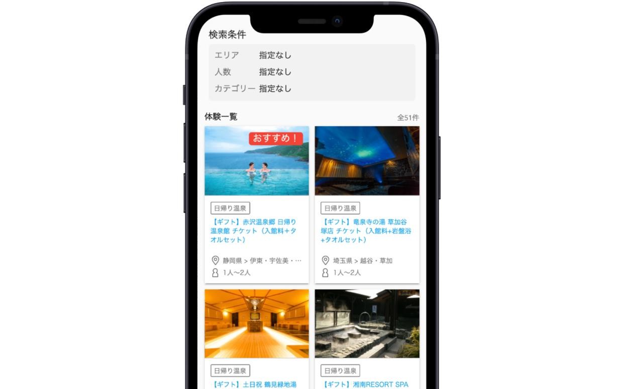 温泉や銭湯好きな方にオススメの体験ギフト。日本全国の人気温浴施設を収録。海を眺めながらや森林浴を楽しみながら入浴できる温浴施設をはじめ、都会でゆっくり癒やされる施設、リゾートスパ施設などをお選びいただけます。