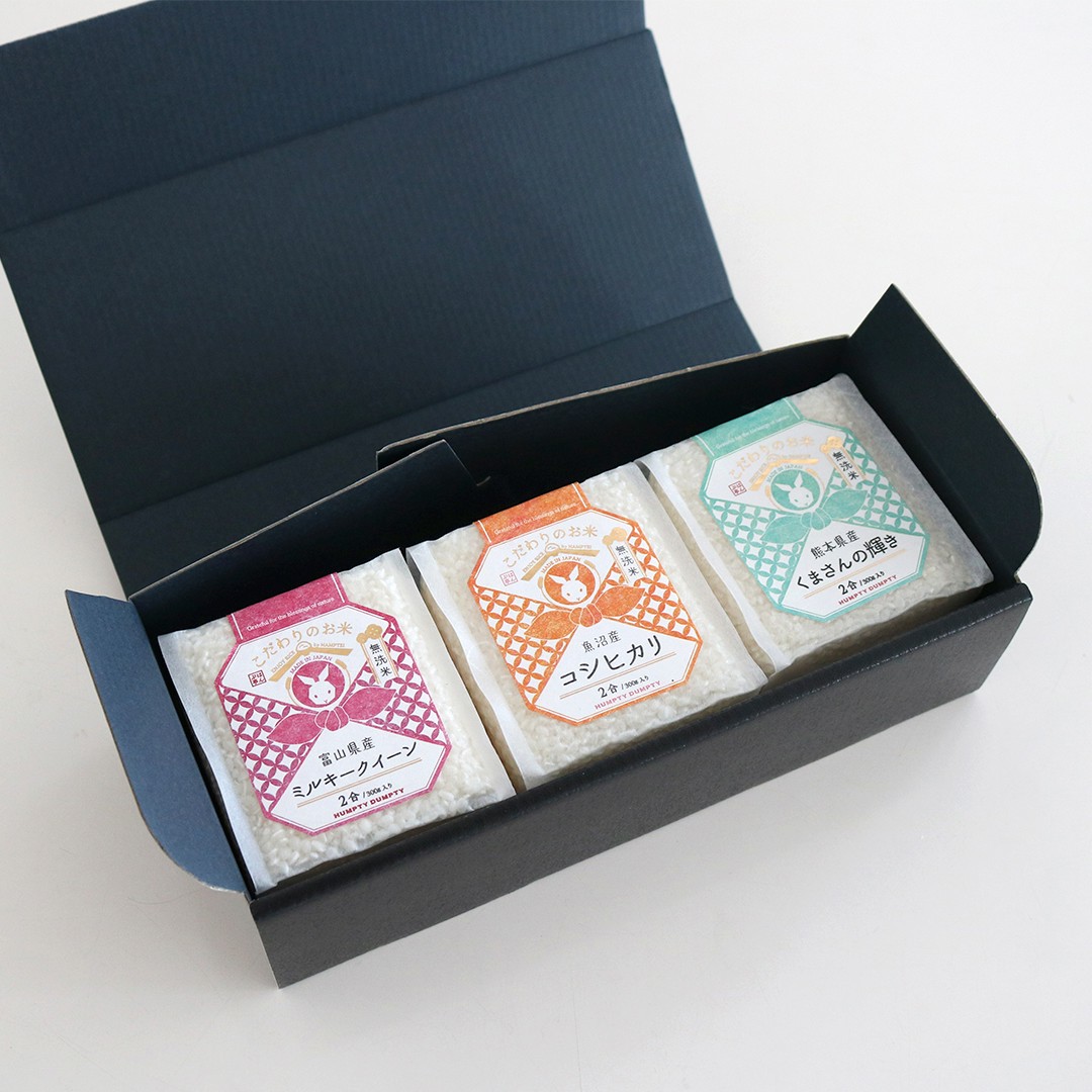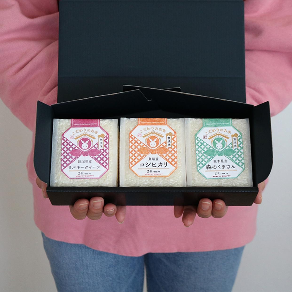 厳選した銘柄のお米を2合パックにし、3個セットにしました。