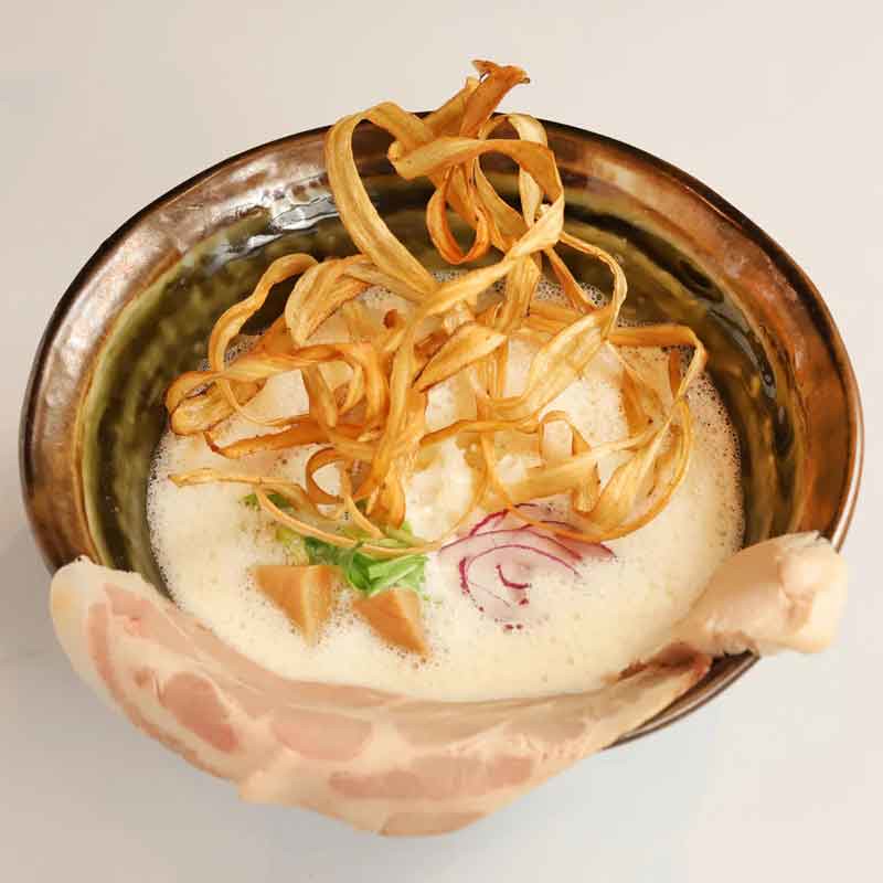 鹿児島県産、桜島鶏のみで丁寧に仕込む濃厚白湯スープ。雑味がなく、旨み溢れる自信作。鷄を最大限に活かす独自製法で抽出。直前に煮干しスープと鶏脂を提供