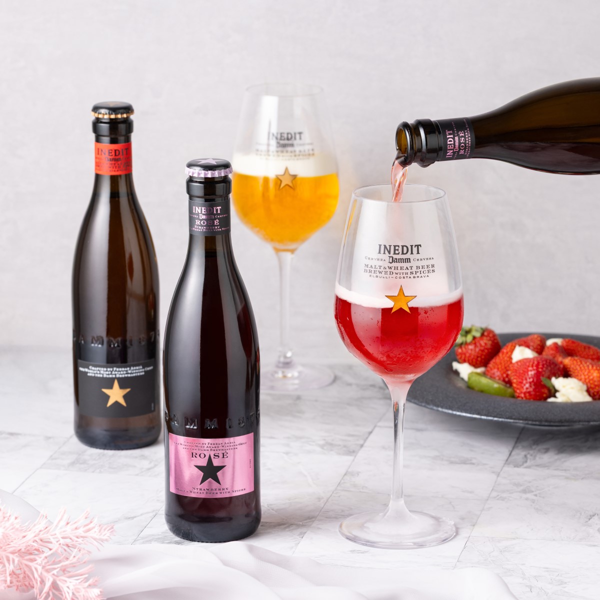 大麦麦芽を使用したラガービールと小麦を使用したホワイトビールをブレンドするという独自の手法で造られる「イネディット」をベースに、濃厚なストロベリーの果汁を贅沢にブレンド。